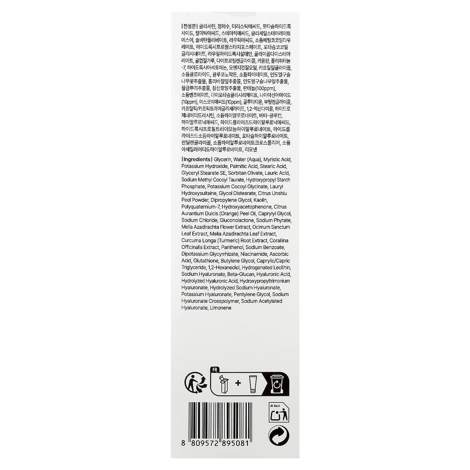 Глицерин, вода, миристиновая кислота, гидроксид калия, пальмитиновая кислота, стеариновая кислота, глицерил стеарат эмульгирующий, сорбитан оливат, лауриновая кислота, натрия метил кокоил таурат, гидроксипропил фосфат крахмала, кокоил глицинат калия, лаурил гидроксисултаин, гликоль дистеарат, порошок из цедры мандарина (Citrus unshiu), дипропиленгликоль, каолин, поликватерниум-7, гидроксиацетофенон, масло из цедры апельсина (Citrus aurantium dulcis), каприлилгликоль, хлорид натрия, глюконолактон, фитат натрия, экстракт цветков дерева ним (Melia azadirachta), экстракт листьев туласи (Ocimum sanctum), экстракт листьев дерева ним (Melia azadirachta), экстракт корня куркумы (Curcuma longa), экстракт кораллины лекарственной (Corallina officinalis), пантенол, бензоат натрия, дикалия глицирризат, никотинамид, аскорбиновая кислота, глутатион, бутиленгликоль, каприловый/каприновый триглицерид, 1,2-гександиол, гидрогенизированный лецитин, гиалуронат натрия, бета-глюкан, гиалуроновая кислота, гидролизованная гиалуроновая кислота, гиалуронат гидроксипропилтримония, гидролизованный гиалуронат натрия, гиалуронат калия, пентилен гликоль, кроссполимер гиалуроната натрия, ацетилированный гиалуронат натрия, лимонен.