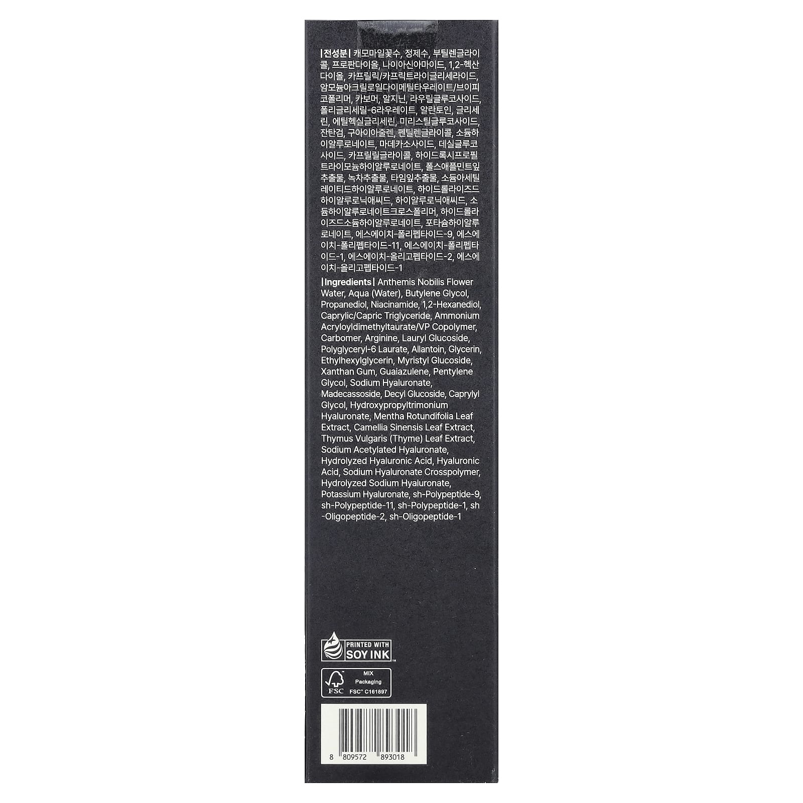 Цветочная вода Anthemis nobilis, вода (Aqua), бутиленгликоль, пропандиол, никотинамид, 1,2-гександиол, каприловый/каприновый триглицерид, аммоний акрилоилдиметилтаурат/ВП сополимер, карбомер, аргинин, лаурил глюкозид, полиглицерил-6 лаурат, аллантоин, глицерин, этилгексилглицерин, миристил глюкозид, ксантановая камедь, гваязулен, пентилен гликоль, гиалуронат натрия, мадекассосид, децил глюкозид, каприлилгликоль, гиалуронат гидроксипропилтримония, экстракт листьев мяты яблочной (Mentha rotundifolia), экстракт листьев зеленого чая (Camellia sinensis), экстракт листьев чабреца (Thymus vulgaris), ацетилированный гиалуронат натрия, гидролизованная гиалуроновая кислота, гиалуроновая кислота, кроссполимер гиалуроната натрия, гидролизованный гиалуронат натрия, гиалуронат калия, sh-полипептид-9, sh-полипептид-11, sh-полипептид-1, sh-олигопептид-2, sh-олигопептид-1.