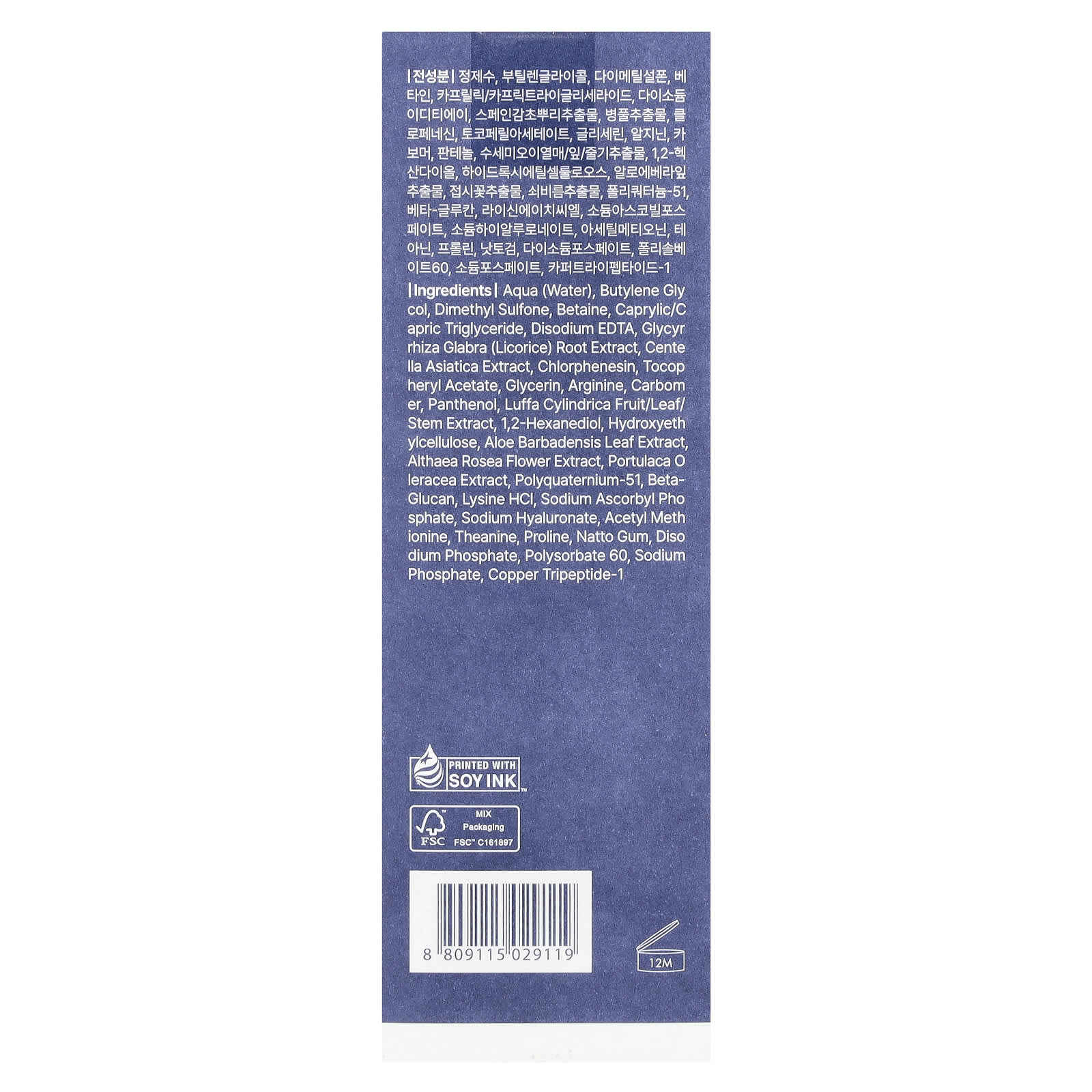 Вода (Aqua), бутилен гликоль, диметилсульфон, бетаин, каприловый/каприновый триглицерид, двунатриевая ЭДТК, экстракт корня солодки (Glycyrrhiza glabra), экстракт готу колы (Centella asiatica), хлорфенезин, токоферилацетат, глицерин, аргинин, карбомер, пантенол, экстракт плодов/листьев/стеблей люффы египетской (Luffa cylindrica), 1,2-гександиол, гидроксиэтилцеллюлоза, экстракт листьев алоэ вера (Aloe barbadensis), экстракт цветков штокрозы розовой (Althaea rosea), экстракт портулака огородного (Portulaca oleracea), поликватерниум-51, бета-глюкан, лизина гидрохлорид, аскорбил фосфат натрия, гиалуронат натрия, ацетил метионин, теанин, пролин, смола натто, динатрия фосфат, полисорбат 60, фосфат натрия, трипептид меди-1.