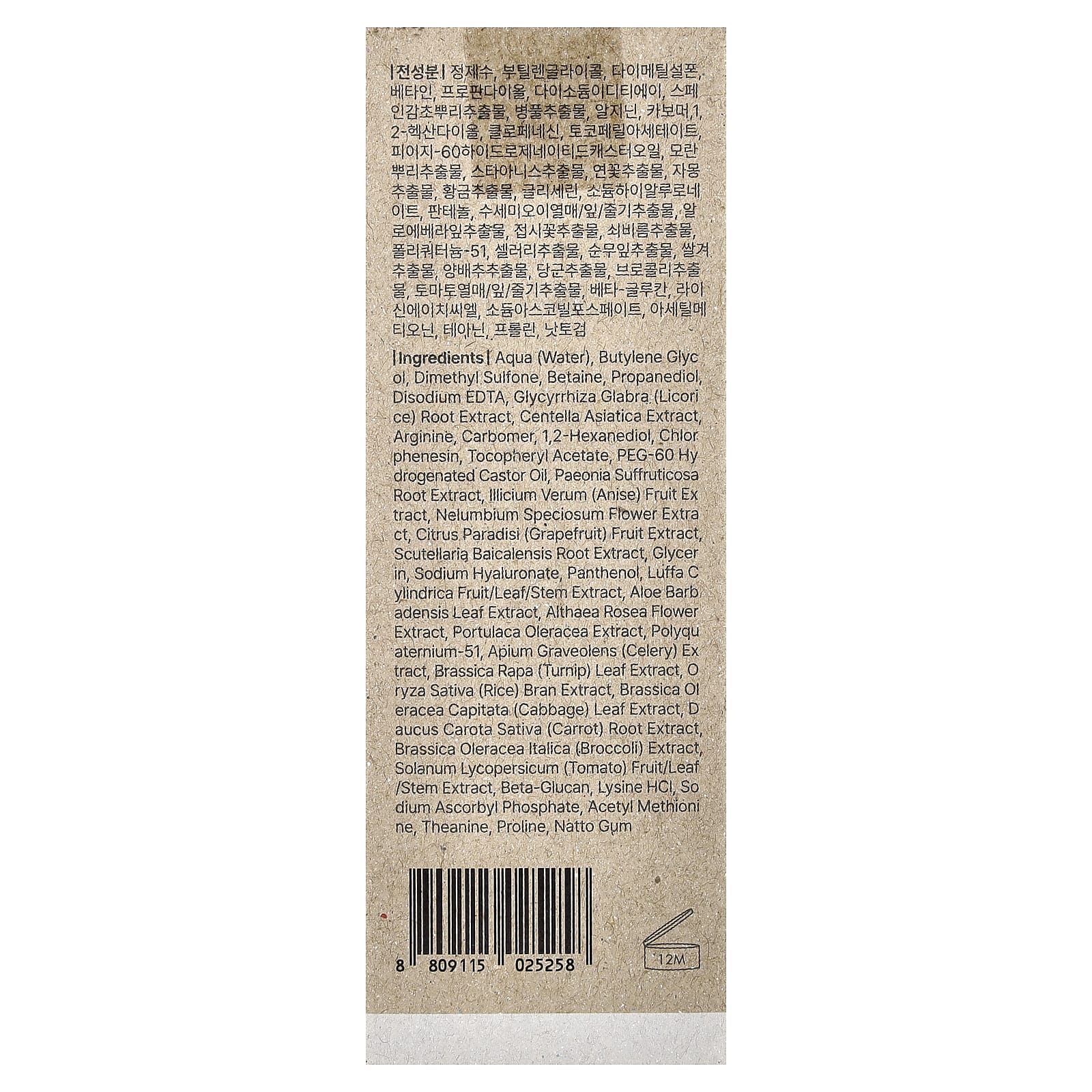 Вода, бутиленгликоль, диметилсульфон, бетаин, пропандиол, двунатриевая ЭДТК, экстракт корня солодки (Glycyrrhiza glabra), экстракт готу колы (Centella asiatica), аргинин, карбомер, 1,2-гександиол, хлорфенезин, токоферилацетат, ПЭГ-60 гидрогенизированное касторовое масло, экстракт корня пиона (Paeonia suffruticosa), экстракт плодов аниса звездчатого (Illicium verum), экстракт цветков лотоса (Nelumbium speciosum), экстракт плодов грейпфрута (Citrus paradisi), экстракт корня шлемника (Scutellaria baicalensis), глицерин, гиалуронат натрия, пантенол, экстракт плодов/листьев/стеблей люффы египетской (Luffa cylindrica), экстракт листьев алоэ вера (Aloe barbadensis), экстракт цветков штокрозы розовой (Althaea rosea), экстракт портулака огородного (Portulaca oleracea), поликватерниум-51, экстракт сельдерея (Apium graveolens), экстракт листьев репы (Brassica rapa), экстракт рисовых отрубей (Oryza sativa), экстракт листьев капусты огородной (Brassica oleracea), экстракт корнеплода моркови (Daucus carota sativa), экстракт брокколи (Brassica oleracea italica), экстракт плодов/листьев/стеблей томата (Solanum lycopersicum), бета-глюкан, лизин гидрохлорид, аскорбил фосфат натрия, ацетил метионин, теанин, пролин, камедь натто.