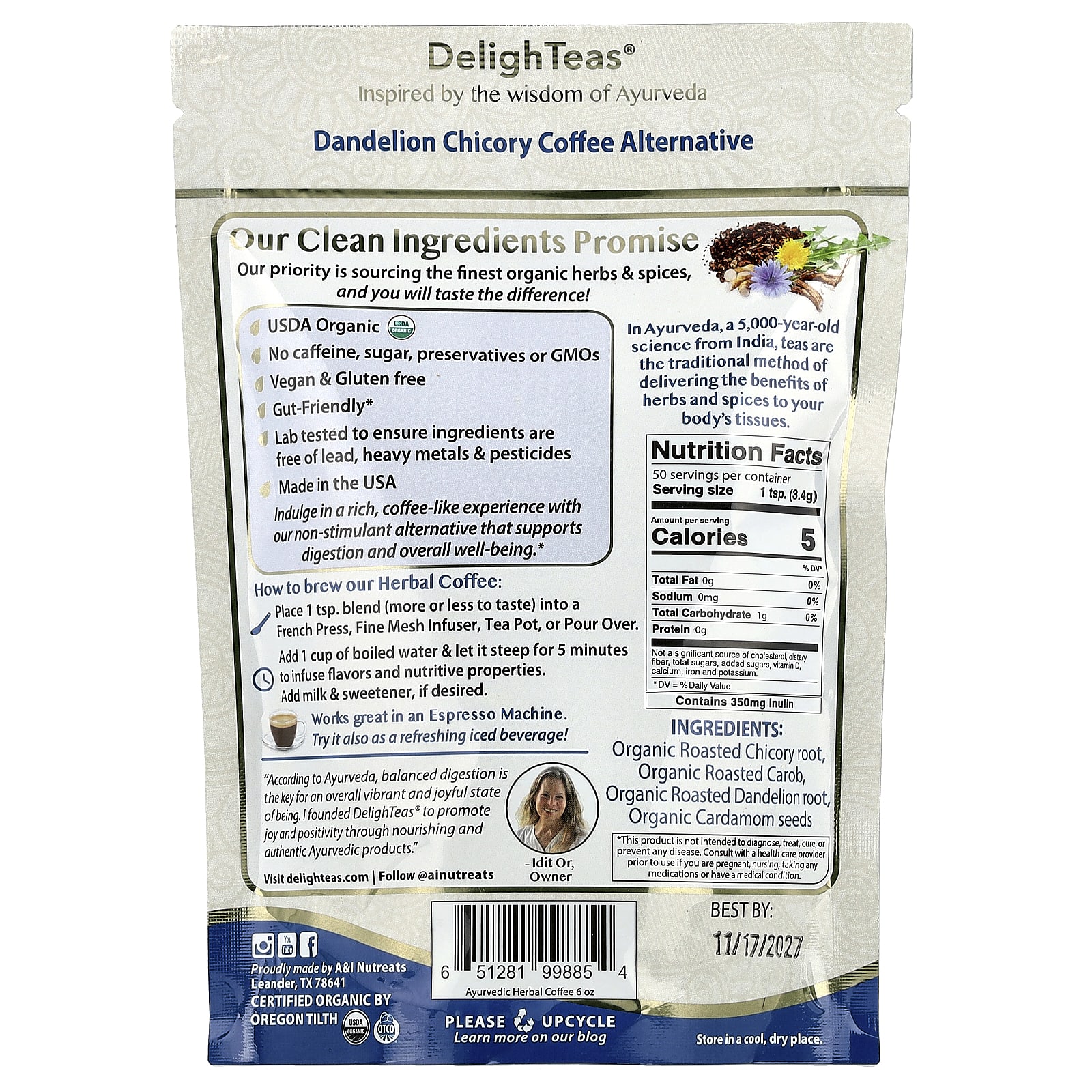 «Согласно Аюрведе, сбалансированное пищеварение является ключом к общему яркому и радостному состоянию. Я основал DelighTeas®, чтобы способствовать радости и позитивному настрою с помощью питательных и аутентичных аюрведических продуктов ».