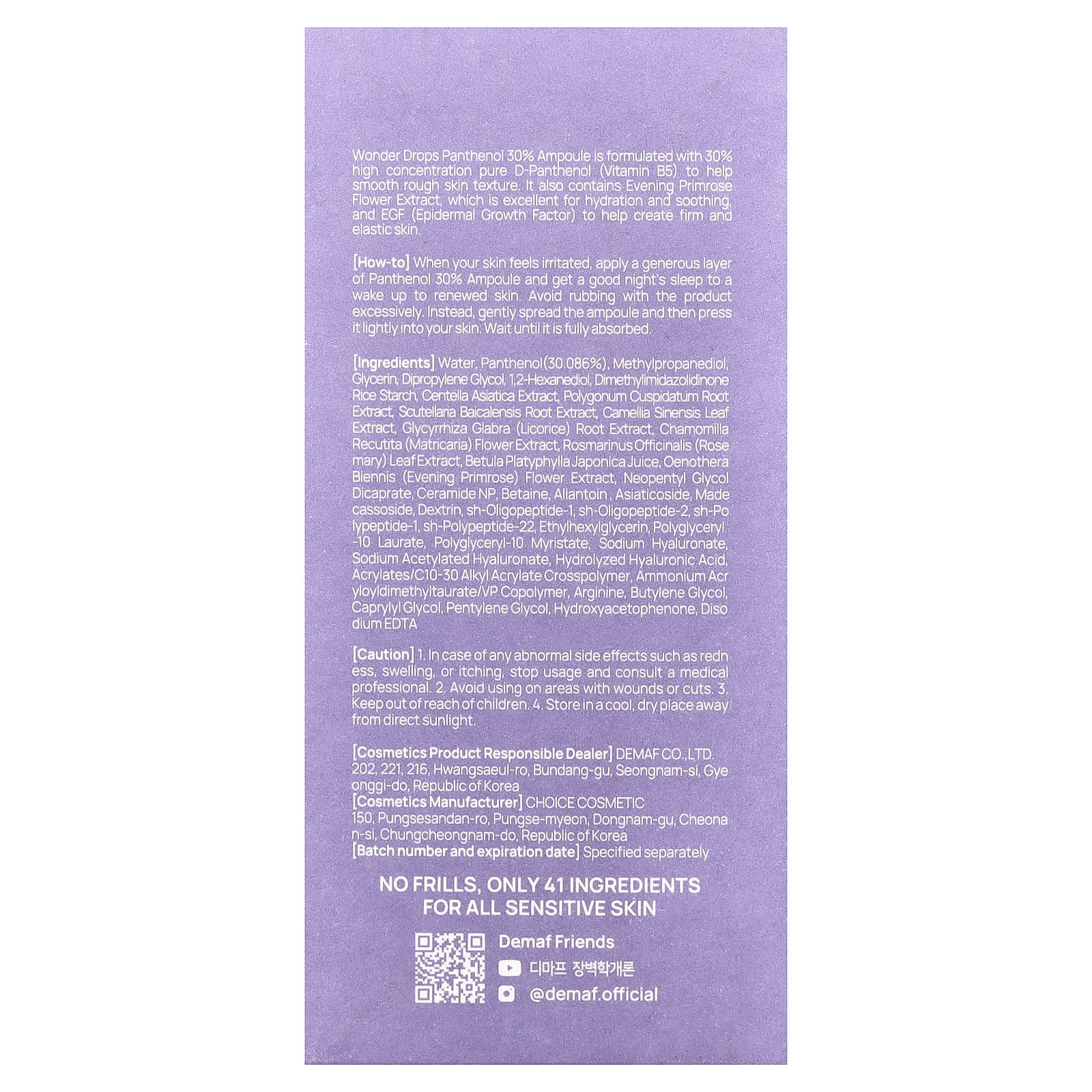 Вода, пантенол (30,086%), метилпропандиол, глицерин, дипропиленгликоль, 1,2-гександиол, диметилимидазолидинон рисовый крахмал, экстракт готу колы (Centella asiatica), экстракт корня рейнутрии японской (Polygonum cuspidatum), экстракт корня шлемника (Scutellaria baicalensis), экстракт листьев зелёного чая (Camellia sinensis), экстракт корня солодки (Glycyrrhiza glabra), экстракт цветков ромашки лекарственной (Chamomilla recutita), экстракт листьев розмарина (Rosmarinus officinalis), сок берёзы плосколистой японской (Betula platyphylla japonica), экстракт цветков примулы вечерней (Oenothera biennis), неопентилгликоль дикапрат, керамид NP, бетаин, аллантоин, азиатикозид, мадекассосид, декстрин, sh-олигопептид-1, sh-олигопептид-2, sh-полипептид-1, sh-полипептид-22, этилгексилглицерин, полиглицерил-10 лаурат, полиглицерил-10 миристат, гиалуронат натрия ацетилированный гиалуронат натрия, гидролизованная гиалуроновая кислота, акрилат/c10-30 алкил акрилат кроссполимер, аммоний акрилоилдиметилтаурат/ВП сополимер, аргинин, бутиленгликоль, каприлилгликоль, пентилен гликоль, гидроксиацетофенон, двунатриевая ЭДТК.