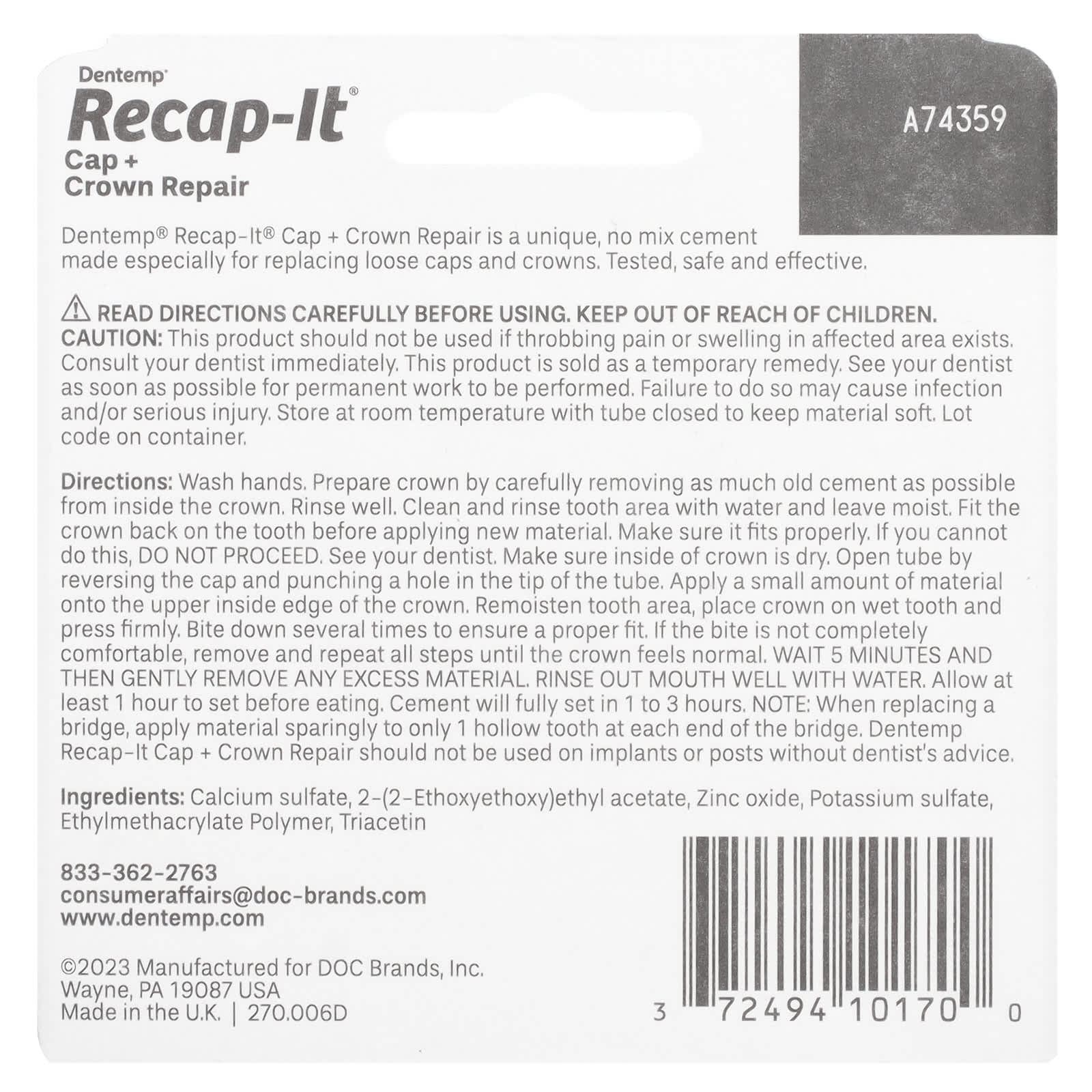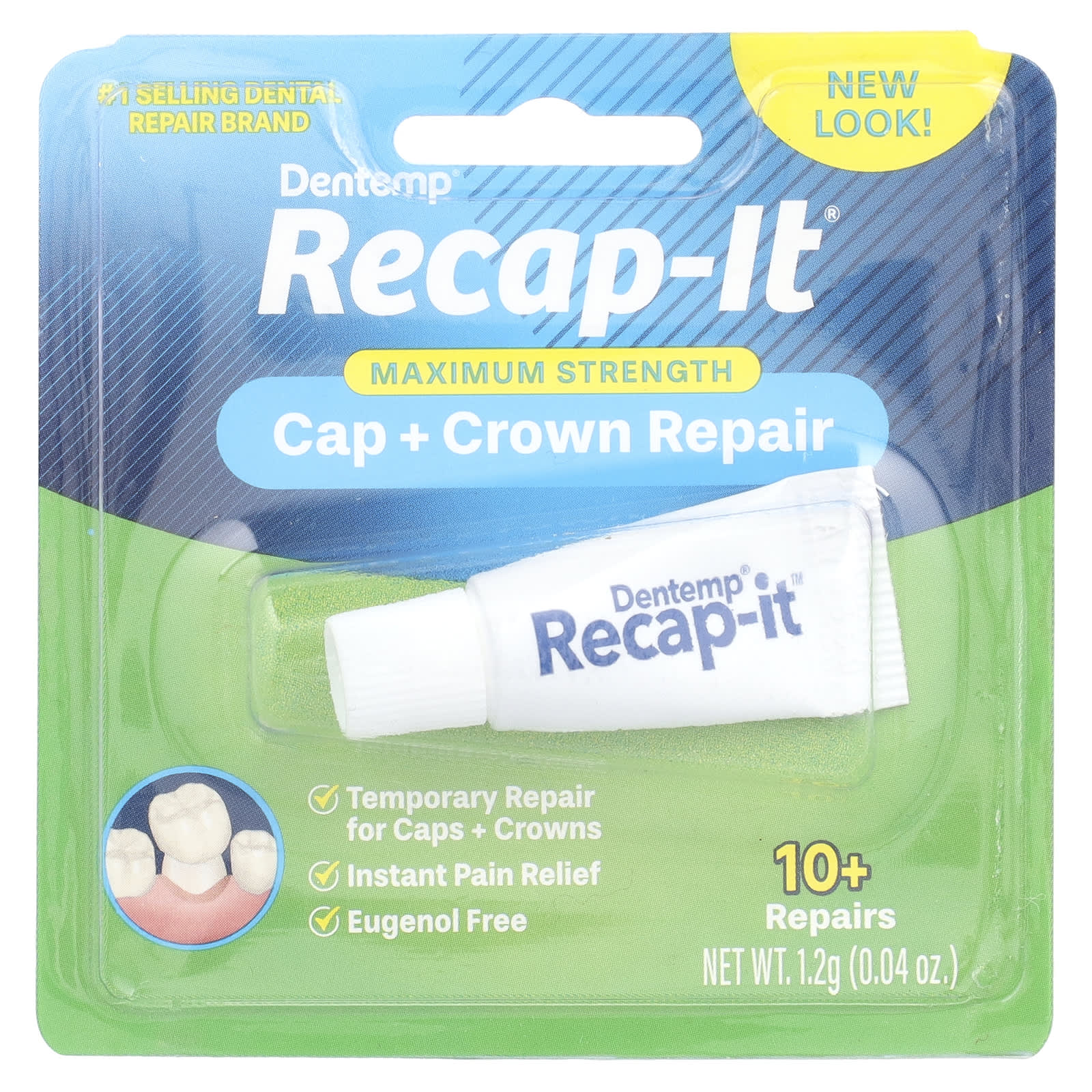 Dentemp® Recap-It ™ Cap & Crown Repair - это уникальный несмешиваемый цемент, специально предназначенный для замены незакрепленных коронок и коронок. Протестировано, безопасно и эффективно.