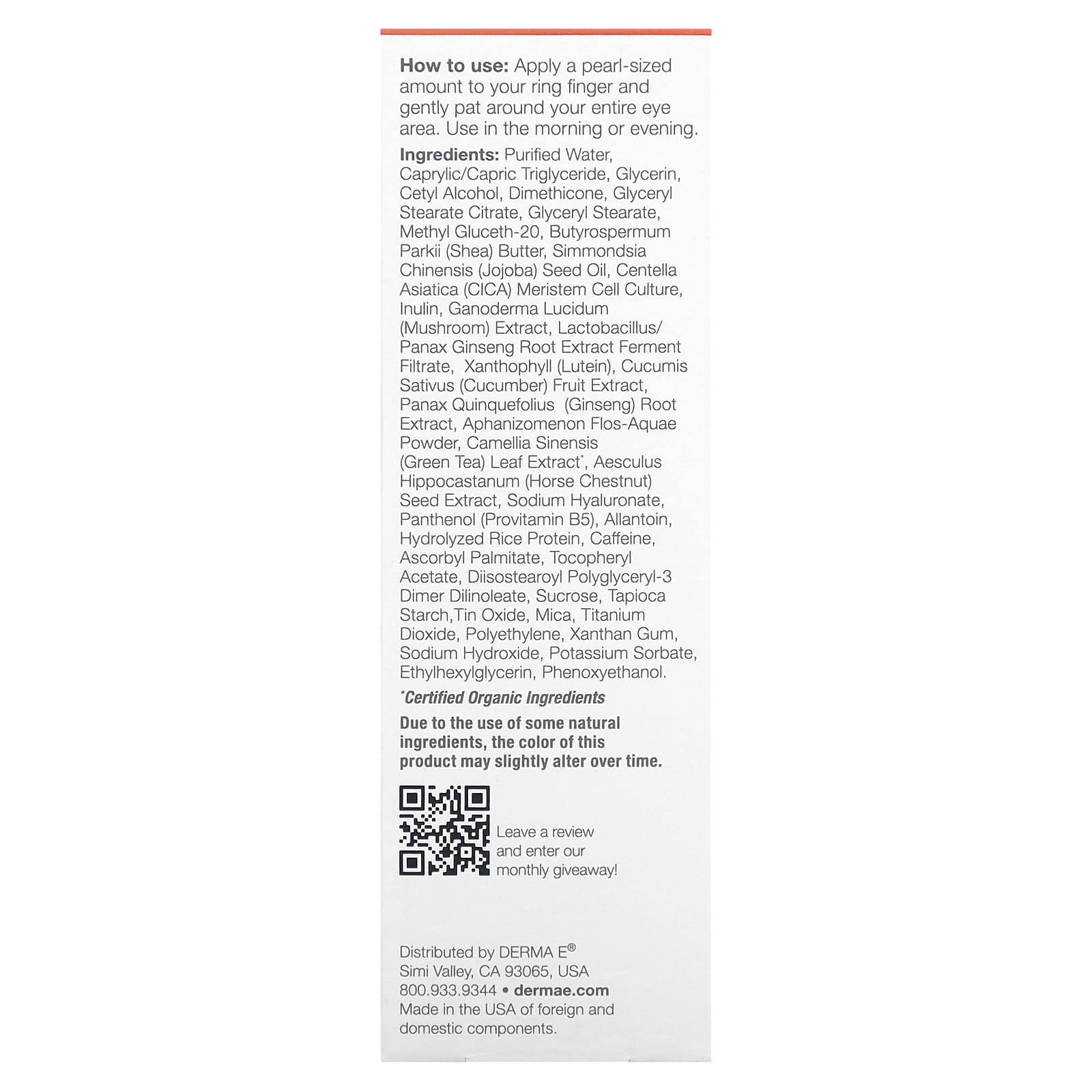Очищенная вода, каприловый/каприновый триглицерид, глицерин, цетиловый спирт, диметикон, глицерил стеарат цитрат, глицерил стеарат, метил глюцет-20, масло ши (Butyrospermum parkii), масло семян жожоба (Simmondsia chinensis), культура клеток меристемы центеллы азиатской (Centella asiatica), инулин, экстракт трутовика лакированного (Ganoderma lucidum), фильтрат фермента экстракта лактобактерий и корня женьшеня (Panax ginseng), ксантофилл (лютеин), экстракт плодов огурца (Cucumis sativus), экстракт корня женьшеня (Panax quinquefolius), Aphanizomenon Flos-Aquae, порошок, экстракт листьев зеленого чая (Camellia sinensis) *, экстракт семян конского каштана (Aesculus hippocastanum), гиалуронат натрия, пантенол (провитамин B5), аллантоин, гидролизованный рисовый протеин, кофеин, аскорбил пальмитат, токоферилацетат, диизостеароил полиглицерил-3 димер дилинолеат, сахароза, тапиоковый крахмал, оксид олова, слюда, диоксид титана, полиэтилен, ксантановая камедь, гидроксид натрия, сорбат калия, этилгексилглицерин, феноксиэтанол.