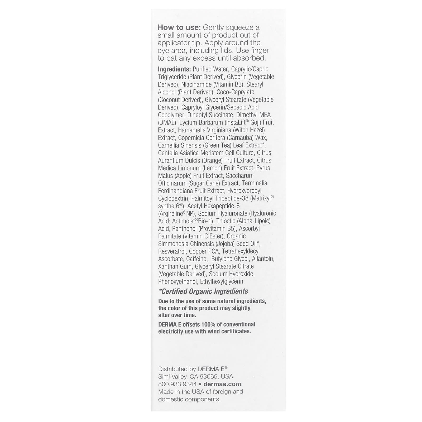 Очищенная вода, каприловый/каприновый триглицерид (растительного происхождения), глицерин (растительного происхождения), никотинамид (витамин B3), стеариловый спирт (растительного происхождения), коко-каприлат (из кокоса), глицерил стеарат (растительного происхождения), каприлоил глицерина/себациновой кислоты сополимер, дигептил сукцинат, диметил МАЭ (ДМАЭ), экстракт ягод годжи (InstaLift®) (Lycium barbarum), экстракт гамамелиса (Hamamelis virginiana), карнаубский воск (Copernicia cerifera), экстракт листьев зеленого чая (Camellia sinensis)*, меристемная клеточная культура готу колы (Centella asiatica), экстракт апельсина (Citrus aurantium dulcis), экстракт плодов лимона (Citrus medica limonum), экстракт яблока (Pyrus malus), экстракт сахарного тростника (Saccharum officinarum), экстракт плодов сливы какаду (Terminalia ferdinandiana), гидроксипропил циклодекстрин, пальмитоил трипептид-38 (Matrixyl® synthe'6®), ацетил гексапептид-8 (Argireline®NP), гиалуронат натрия (гиалуроновая кислота; Actimoist®bio-1), тиоктовая (альфа-липоевая) кислота, пантенол (провитамин B5), аскорбил пальмитат (эфир витамина C), органическое масло семян жожоба (Simmondsia chinensis)*, ресвератрол, медная соль пирролидонкарбоной кислоты, тетрагексилдецил аскорбат, кофеин, бутиленгликоль, аллантоин, ксантановая камедь, глицерил стеарат цитрат (растительного происхождения), гидроксид натрия, феноксиэтанол, этилгексилглицерин.