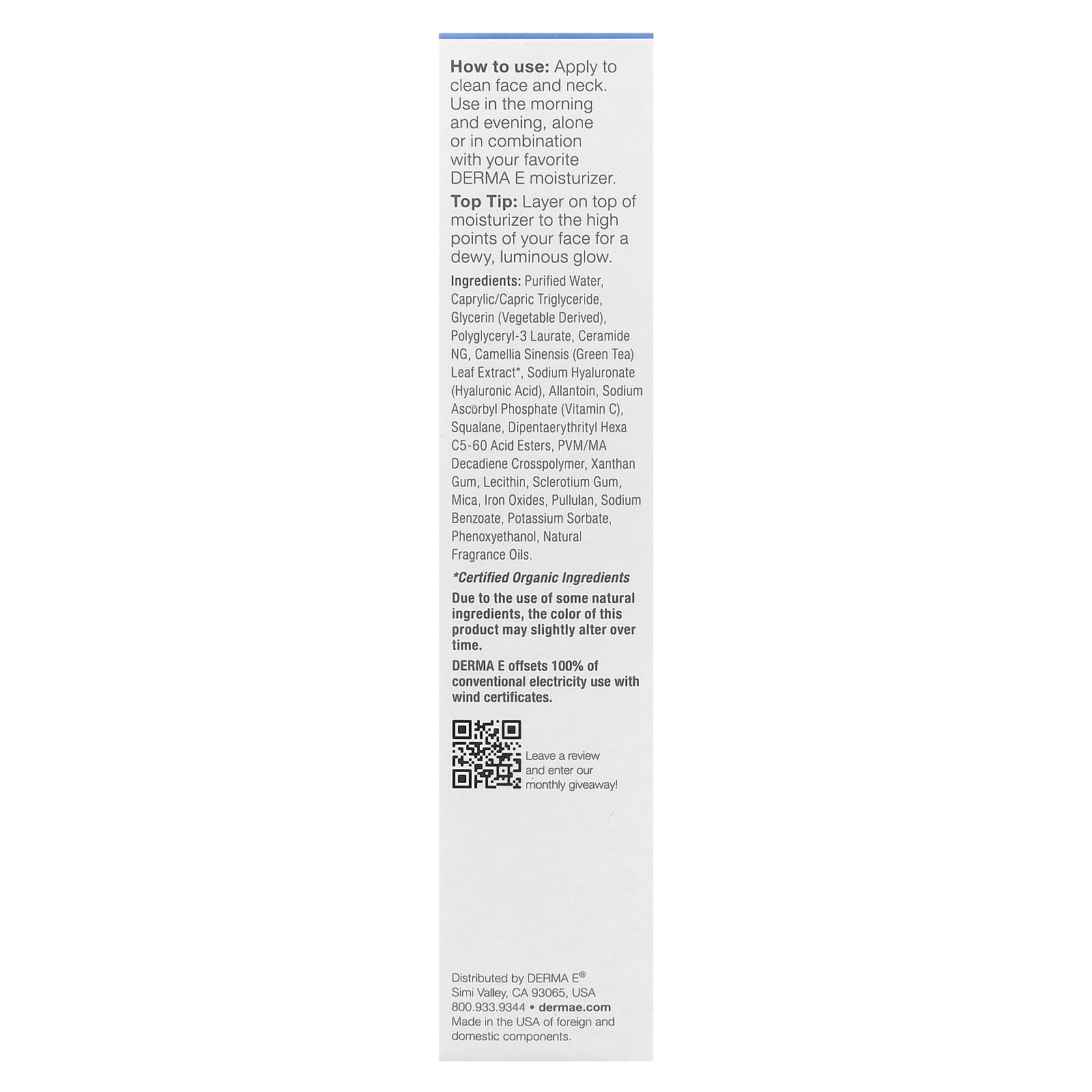 Наносите на чистую кожу лица и шеи. Используйте утром и вечером отдельно или в сочетании с вашим любимым увлажняющим средством от Derma E.