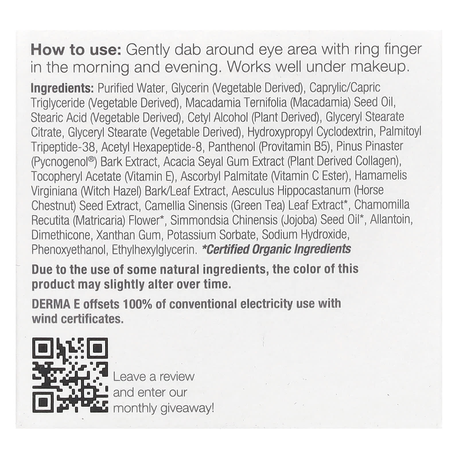 Очищенная вода, глицерин (растительного происхождения), каприловый/каприновый триглицерид (растительного происхождения), масло из семян макадамии (Macadamia ternifolia), стеариновая кислота (растительного происхождения), цетиловый спирт (растительного происхождения), глицерил стеарат цитрат, глицерил стеарат (растительного происхождения), гидроксипропил циклодекстрин, пальмитоил трипептид-38, ацетил гексапептид-8, пантенол (провитамин B5), экстракт коры хвои приморской (Pinus pinaster) (Pycnogenol®), экстракт камеди акации сеяльской (Acacia seyal) (коллаген растительного происхождения), токоферилацетат (витамин Е), аскорбил пальмитат (эфир витамина C), экстракт коры/листьев гамамелиса (Hamamelis virginiana), экстракт семян конского каштана (Aesculus hippocastanum), экстракт листьев зелёного чая (Camellia sinensis)*, цветки ромашки лекарственной (Chamomilla recutita)*, масло семян жожоба (Simmondsia chinensis)*, аллантоин, диметикон, ксантановая камедь, сорбат калия, гидроксид натрия, феноксиэтанол, этилгексилглицерин.