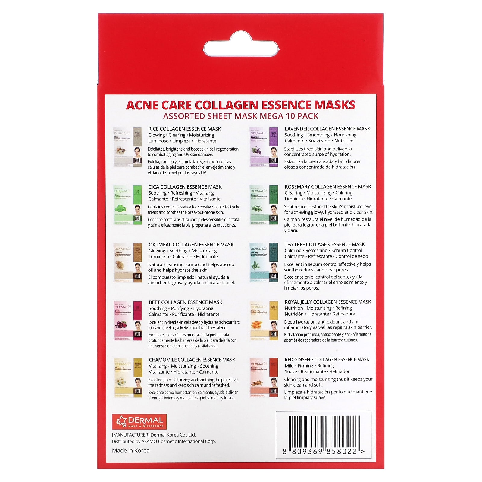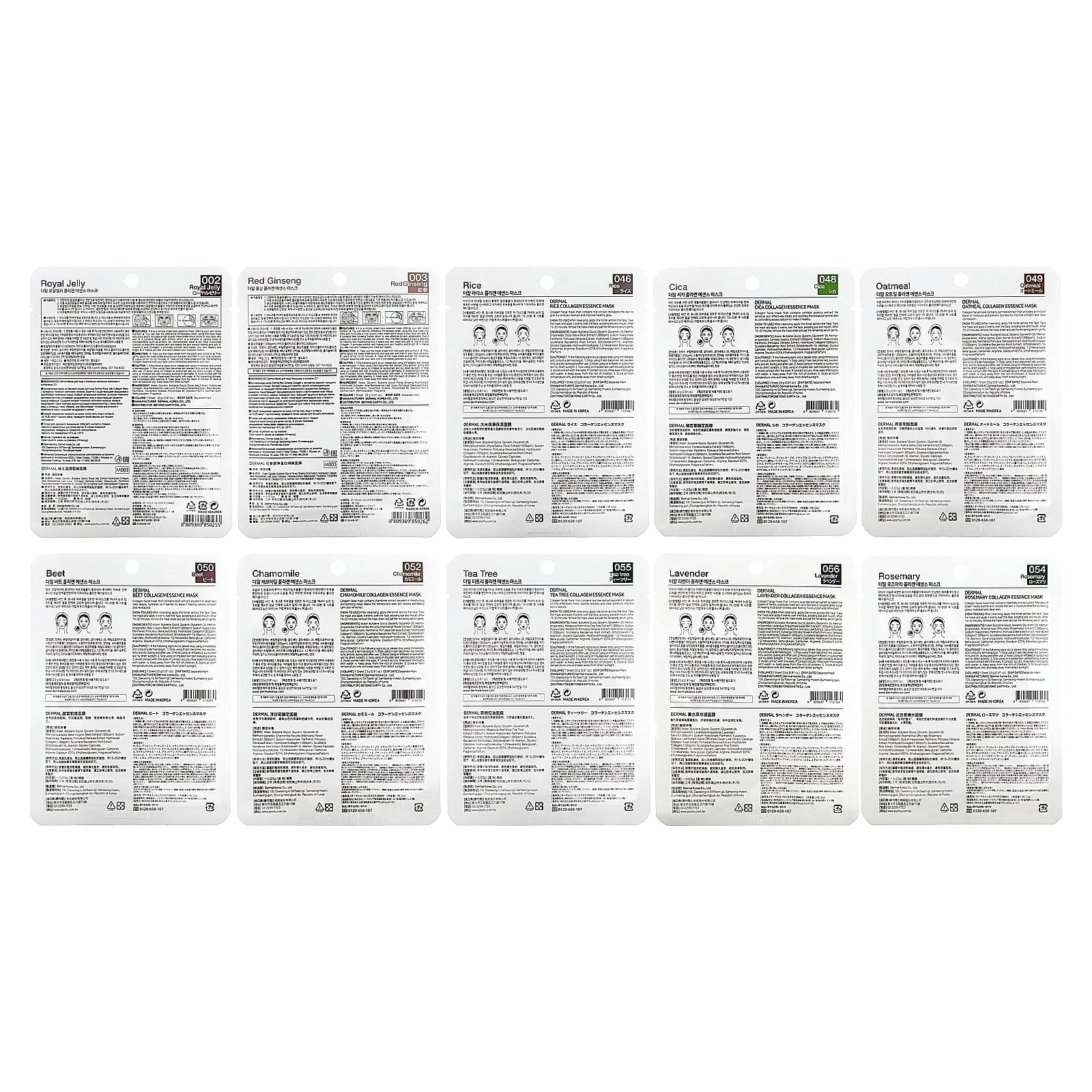 Dermal, Collagen Essence, маски с коллагеном, для ухода за акне, ассорти, 10 шт. по 23 г (0,81 унции)