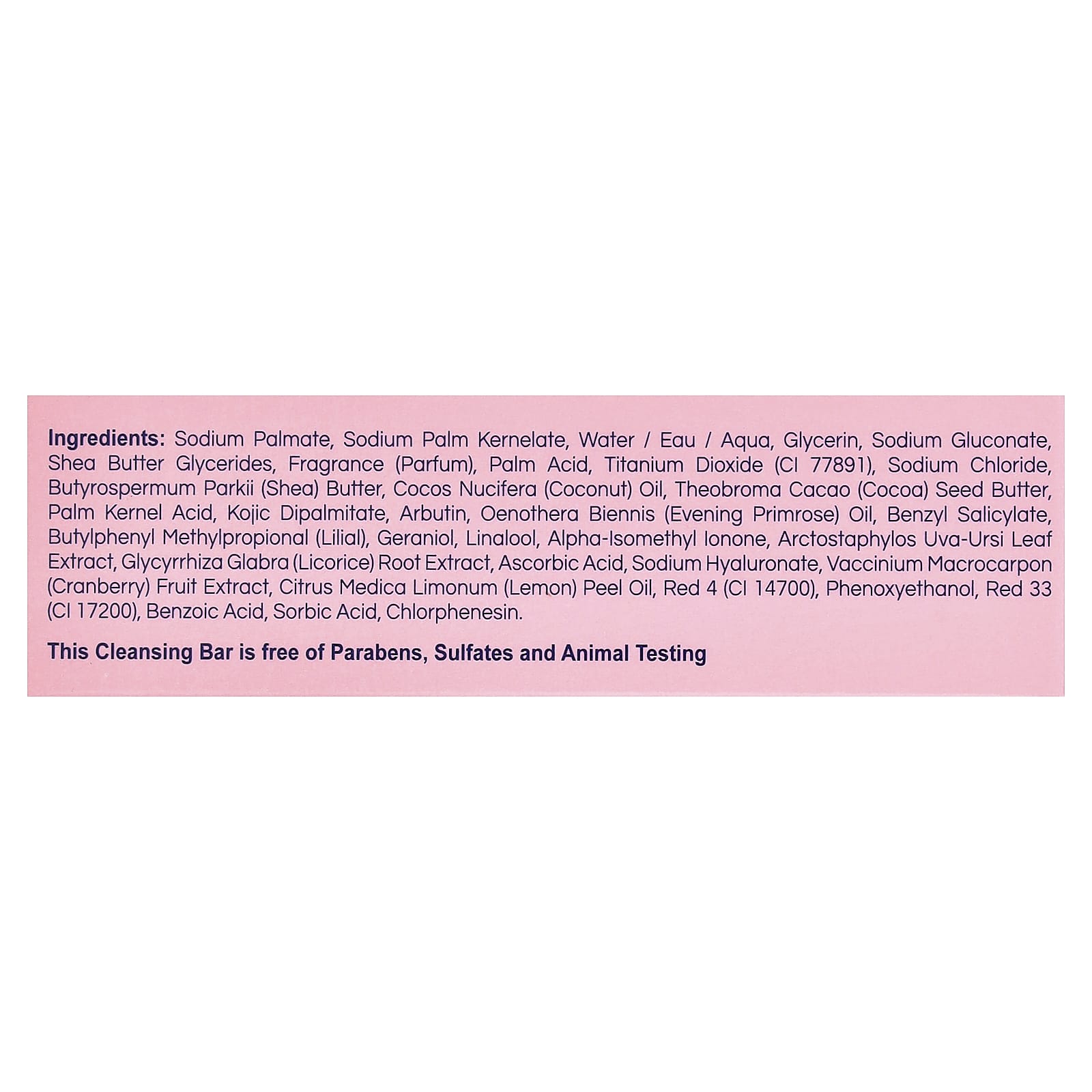 Пальмитат натрия, пальмовый кернелат натрия, вода (eau), глицерин, глюконат натрия, глицериды масла ши, отдушка (парфюмерная композиция), пальмовая кислота, диоксид титана (CI 77891), хлорид натрия, масло ши (Butyrospermum parkii), кокосовое масло (Cocos nucifera), масло из зёрен какао (Theobroma cacao), кислота из ядер кокосового ореха, койевая дипальмитат, арбутин, масло примулы вечерней (Oenothera biennis), бензилсалицилат, бутилфенил метил пропиональ (лилиал), гераниола, линалоол, альфа-изометилионон, экстракт листьев толокнянки обыкновенной (Arctostaphylos uva-ursi), экстракт корня солодки (Glycyrrhiza glabra), аскорбиновая кислота, гиалуронат натрия, экстракт ягод клюквы (Vaccinium macrocarpon), масло из цедры лимона (Citrus medica limonum), краситель красный 4 (CI 14700), феноксиэтанол, краситель красный 33 (CI 17200), бензойная кислота, сорбиновая кислота, хлорфенезин.