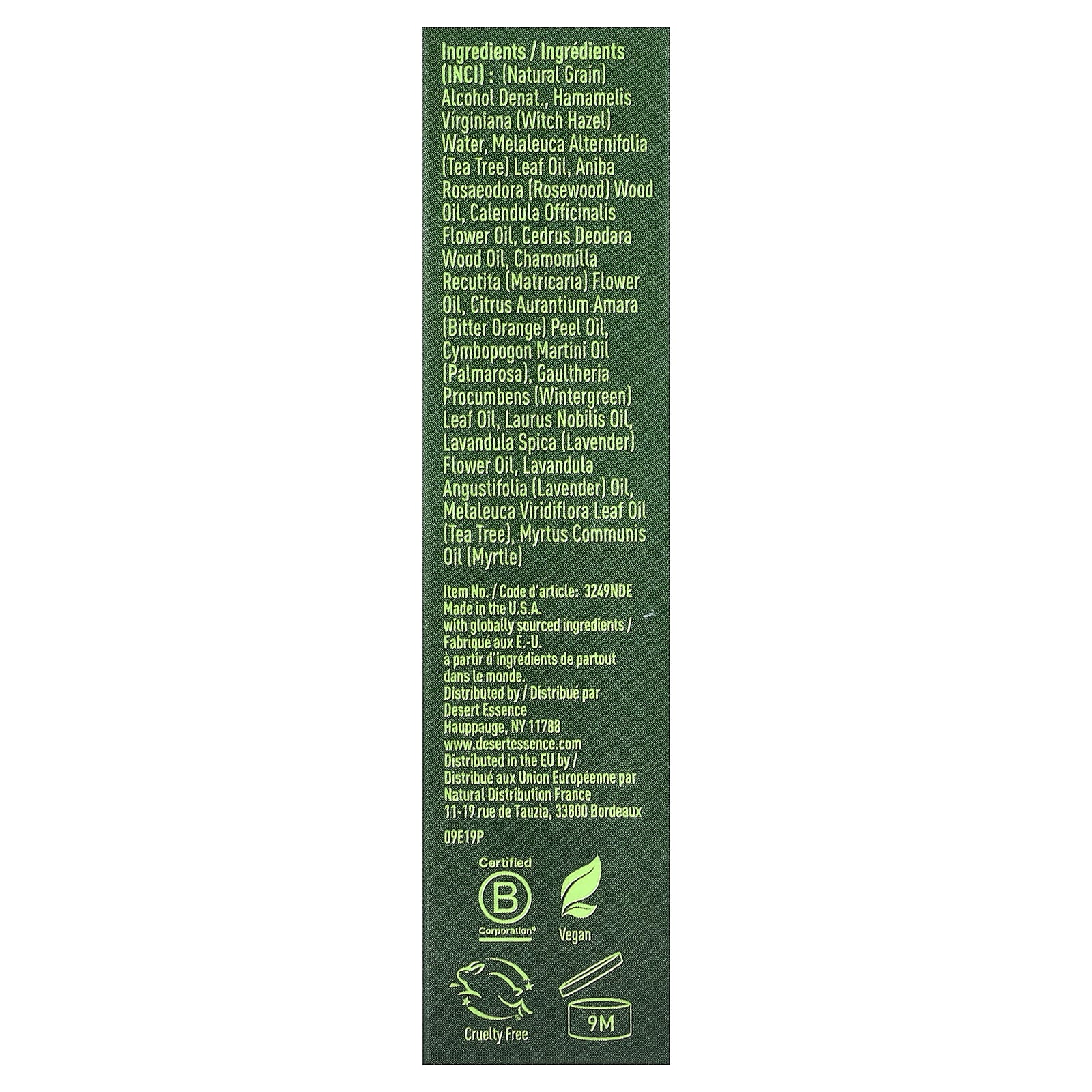 (натуральный зерновой) денатурированный спирт., вода из гамамелиса (Hamamelis virginiana), масло из листьев чайного дерева (Melaleuca alternifolia), древесное масло розового дерева (Aniba rosodora), масло из цветков календулы (Calendula officinalis), масло из древесины кедра (Cedrus deodara), масло из цветков ромашки лекарственной (Chamomilla recutita), масло из кожуры горького апельсина (Citrus aurantium amara), масло пальмарозы (Cymbopogon martini), масло из листьев грушанки (Gaultheria procumbens), масло лавра (Laurus nobilis), масло из цветков лаванды (Lavandula spica), лавандовое масло (Lavandula angustifolia), масло из листьев чайного дерева (Melaleuca viridiflora), масло мирта (Myrtus communis).