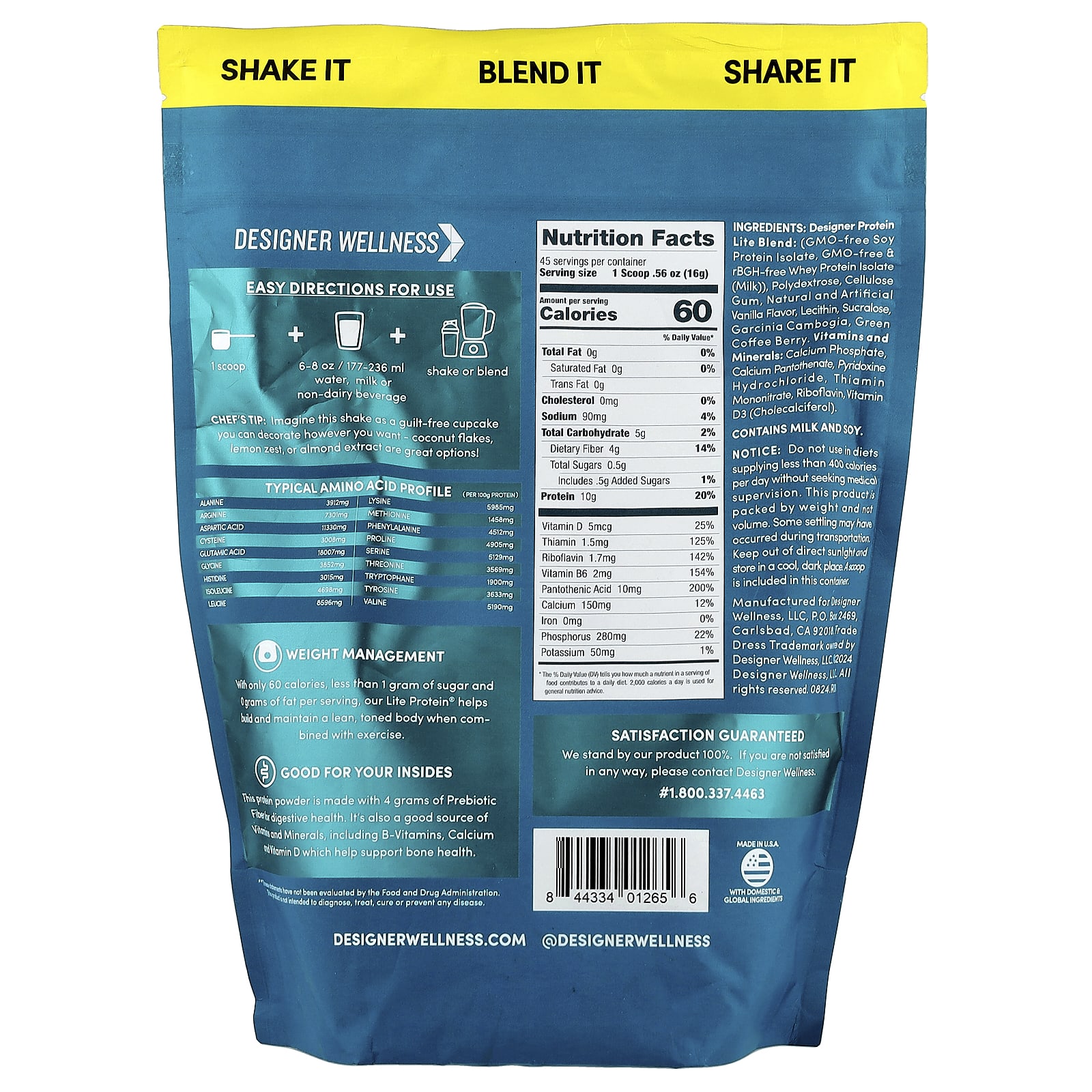 Облегченная смесь Designer Protein: (изолят соевого протеина без ГМО, без ГМО изолят сывороточного протеина без р-БГР (молоко), полидекстроза, целлюлозная камедь, натуральные и искусственные ароматизаторы «Ваниль», лецитин, сукралоза, гарциния камбоджийская, зеленые кофейные ягоды. витамины и минералы: фосфат кальция, пантотенат кальция, пиридоксина гидрохлорид, мононитрат тиамина, рибофлавин, витамин D3 (холекальциферол).