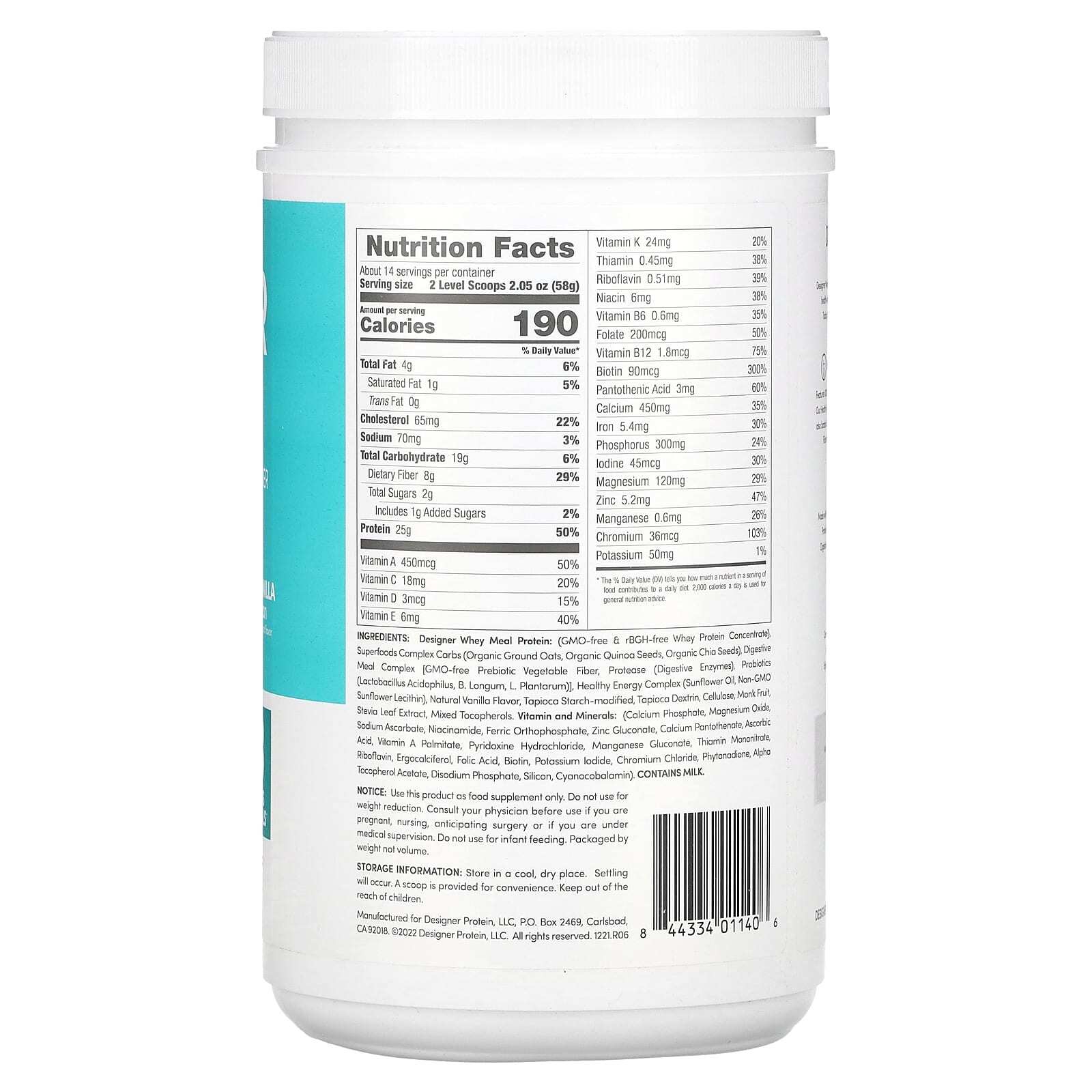 Сывороточный протеин от авторской разработки: (концентрат сывороточного протеина без ГМО и без rbgh), комплексные углеводы из суперфудов (органический молотый овес, органические семена киноа, органические семена чиа), пищеварительный комплекс [растительная клетчатка без ГМО и пребиотиков, протеаза (пищеварительные ферменты), пробиотики (лактобактерии ацидофильные, б. Longum, л. plantarum)], комплекс здоровой энергии (подсолнечное масло, подсолнечный лецитин без ГМО), натуральный ароматизатор «Ваниль», модифицированный тапиоковым крахмалом, тапиоковый декстрин, целлюлоза, плод монаха, экстракт листьев стевии, смешанные токоферолы. витамины и минералы (фосфат кальция, оксид магния, аскорбат натрия, никотинамид, ортофосфат железа, глюконат цинка, пантотенат кальция, аскорбиновая кислота, витамин A (пальмитат), пиридоксина гидрохлорид, глюконат марганца, тиамина мононитрат, рибофлавин, эргокальциферол, фолиевая кислота, биотин, йодид калия, хлорид хрома, фитонадион, альфа токоферола ацетат, динатрия фосфат, диоксид, цианокобаламин).