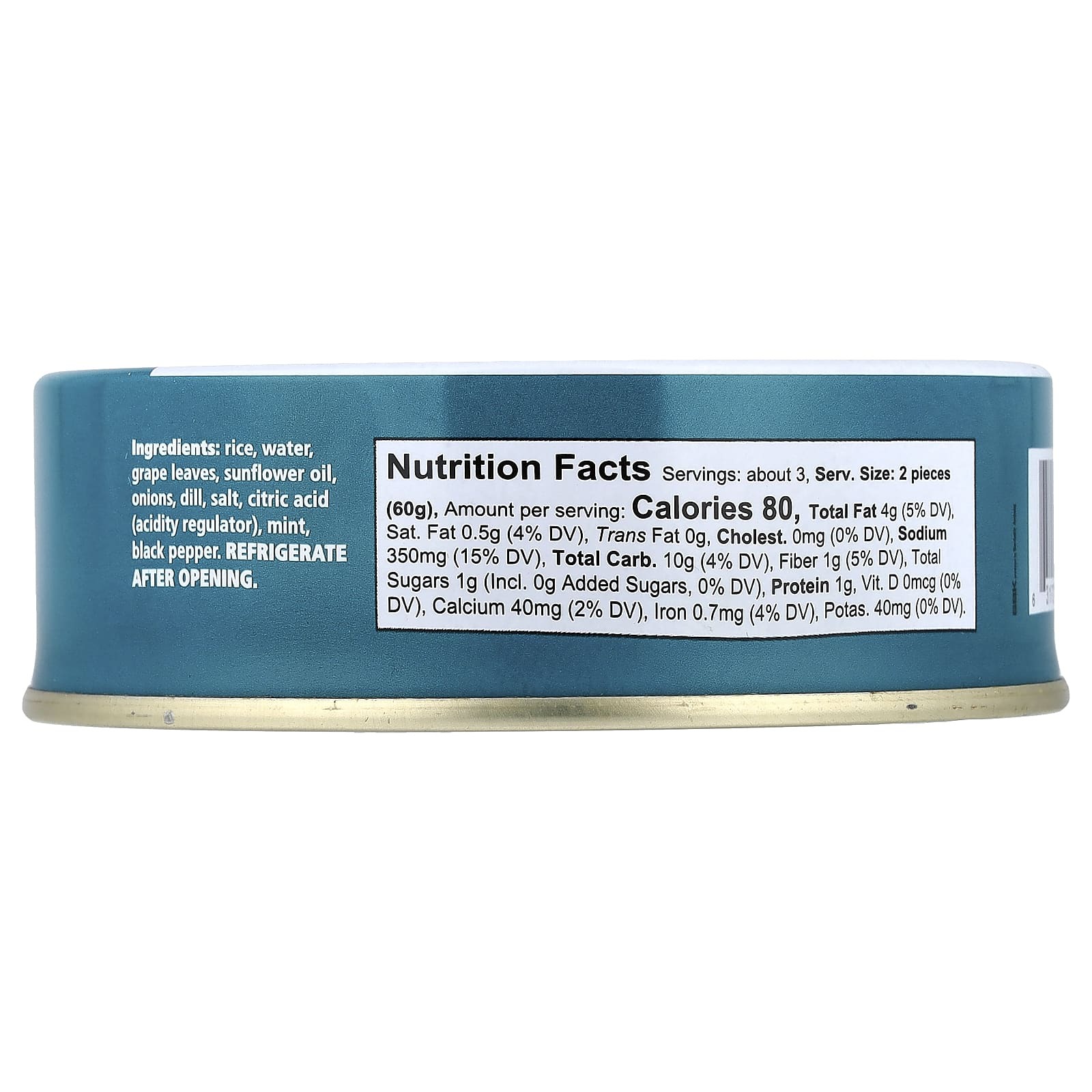 Рис, вода, виноградные листья, подсолнечное масло, лук, укроп, соль, лимонная кислота (регулятор кислотности), яснотковых, черный перец.