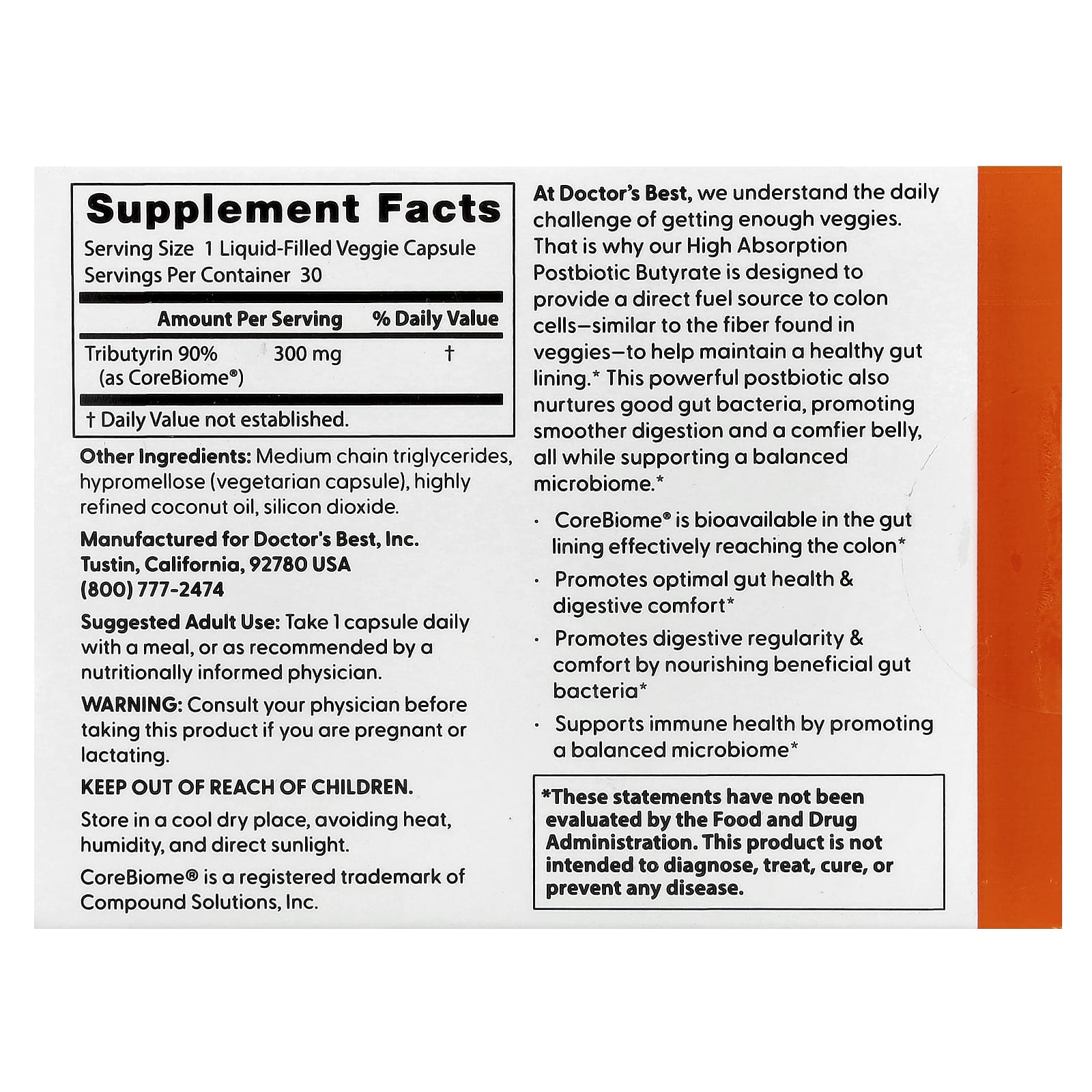 В Doctor's Best мы понимаем, как ежедневно получать достаточное количество овощей. Вот почему наш постбиотический бутират с высокой степенью усвоения предназначен для обеспечения здоровья клеток толстой кишки, подобно клетчатке, содержащейся в овощах, для поддержания здоровья слизистой оболочки кишечника. Этот мощный постбиотик также питает полезные кишечные бактерии, способствуя более гладкому пищеварению и здоровому животу, поддерживая при этом сбалансированный микробиом.