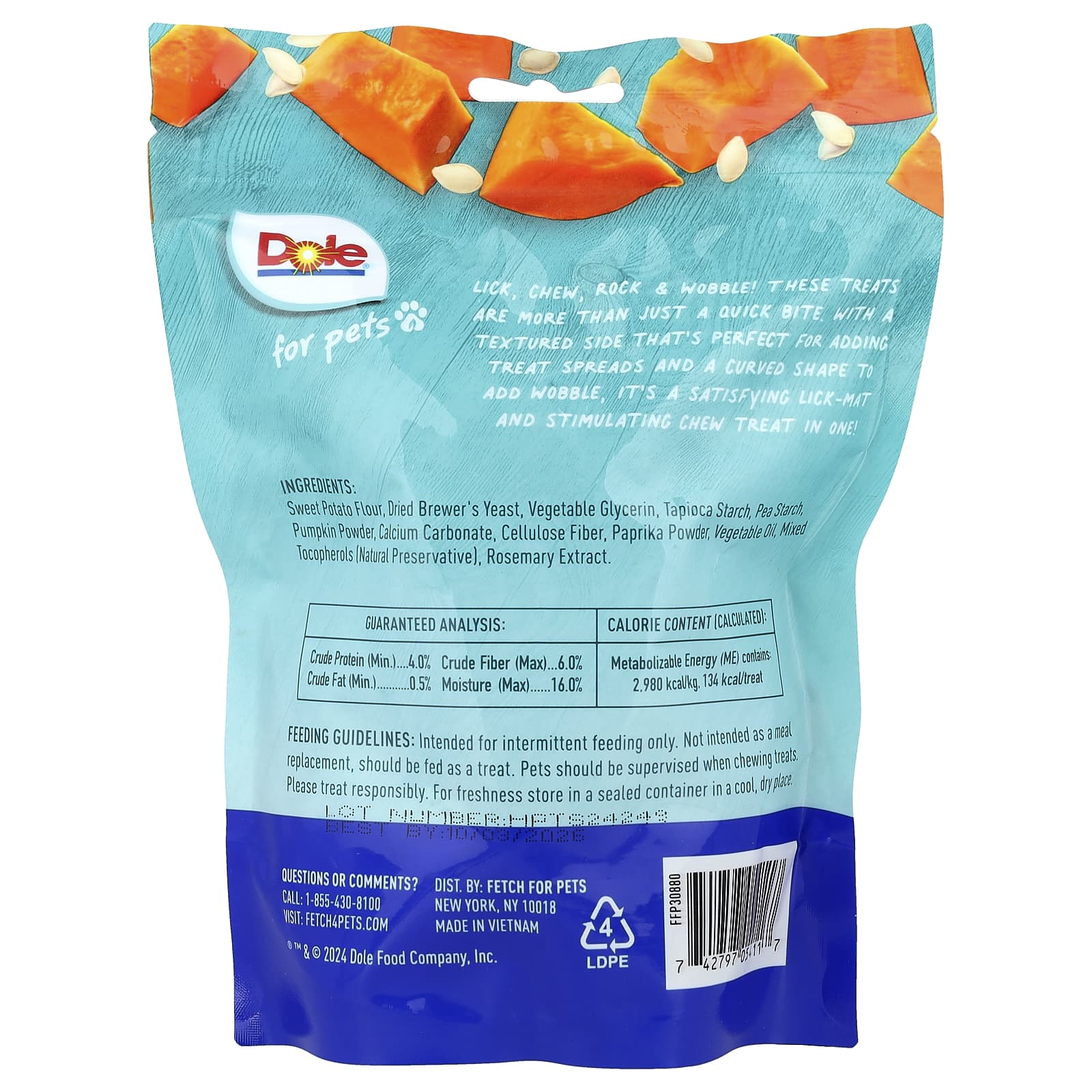Мука из батата, сушеные пивные дрожжи, растительный глицерин, тапиоковый крахмал, гороховый крахмал, порошок из тыквы, карбонат кальция, целлюлозная клетчатка, порошок из паприки, растительное масло, смешанные токоферолы (натуральный консервант), экстракт розмарина.