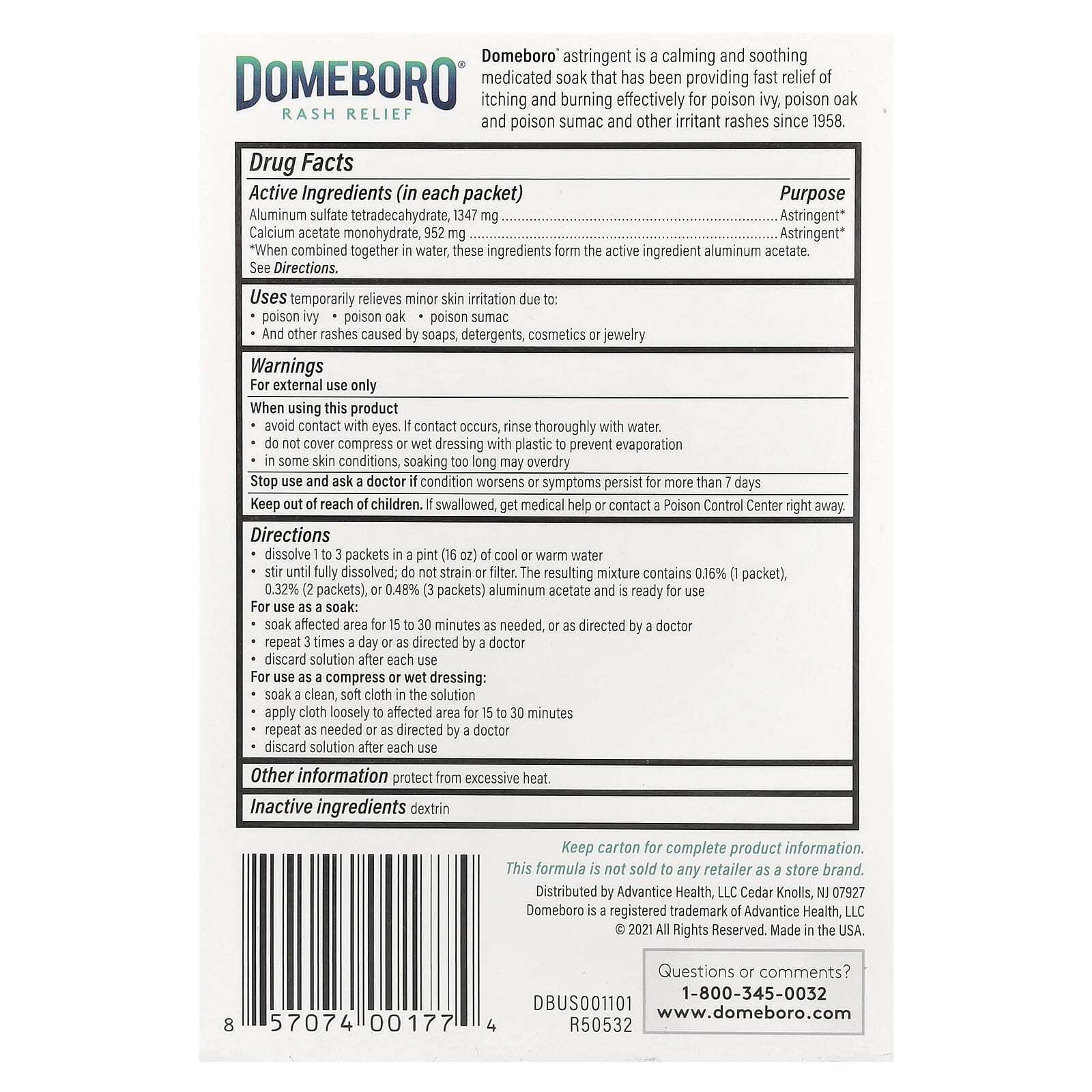 Вяжущее средство Domeboro® — это успокаивающая лечебная ванночка, которая с 1958 года обеспечивает быстрое облегчение зуда и эффективного жжения при высыпаниях, вызванных ядовитым плющом, ядовитым дубом и сумахом, а также за счет других раздражителей.