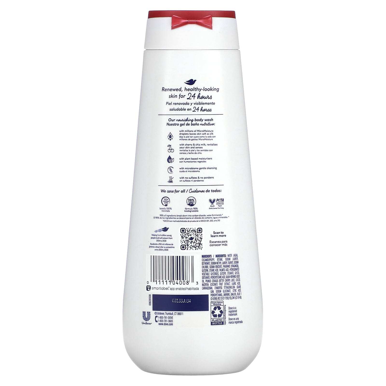 Вода, кокамидопропилбетаин, натрия лауроил изетионат, натрия метил лауроил, таурат, хлорид натрия, бензоат натрия, отдушка, глицерин, стеариновая кислота, пальмитиновая кислота, гидрогенизированные растительные глицериды, глицерил стеарат, гликоль дистеарат, гидроксистеариновая кислота, масло семян чиа (Salvia hispanica), сок горькой вишни (Prunus cerasus), экстракт кокоса (Cocos nucifera), лауриновая кислота, каррагинан, гуаровая камедь (Cyamopsis tetragonoloba), глюконат натрия, лимонная кислота, феноксиэтанол, лимонен линалоол, синий 1 c42090), краситель красный 33 (CI 17200), краситель желтый 5 (CI 19140).