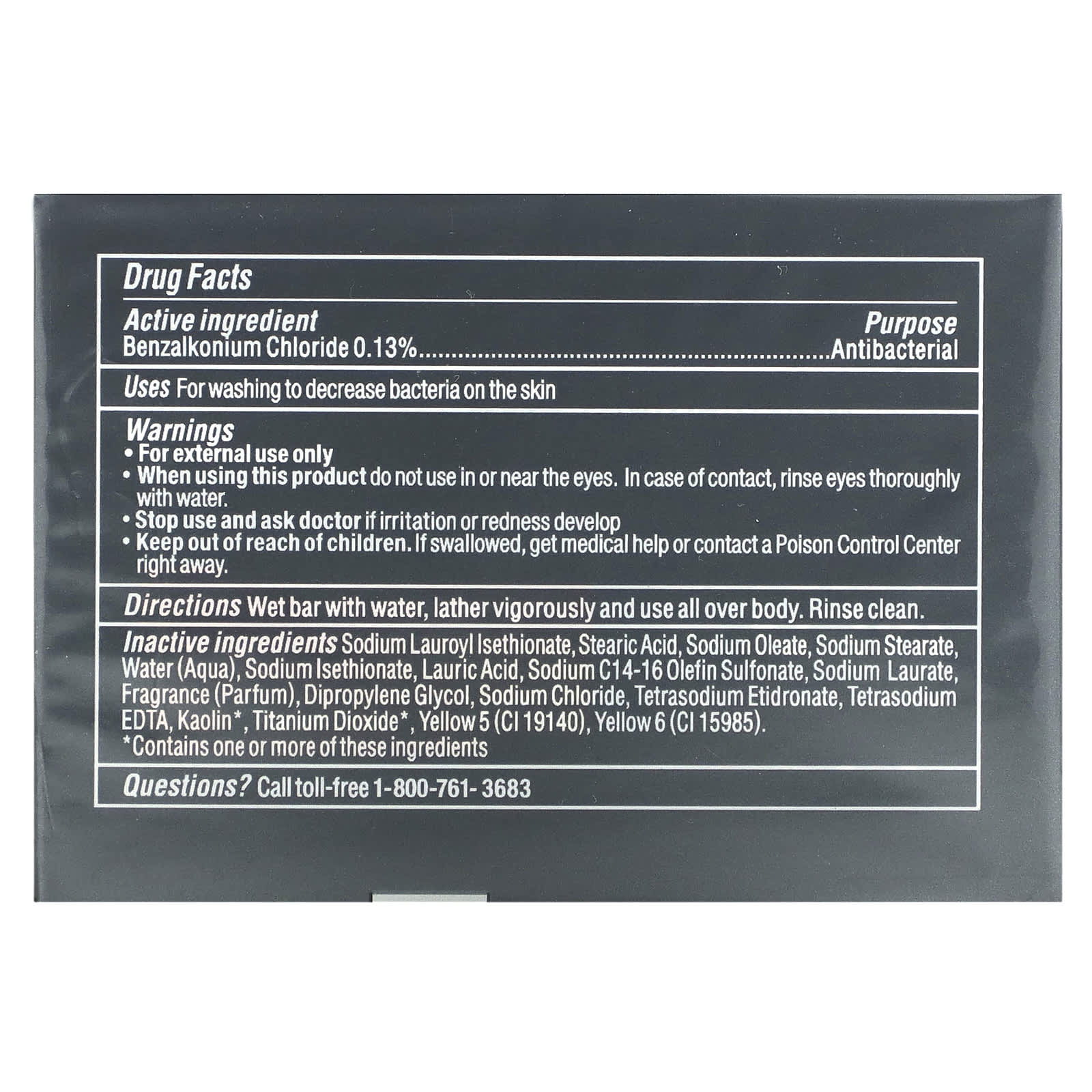| Вспомогательные ингредиенты: натрия лауроил изетионат, стеариновая кислота, олеат натрия, стеарат натрия, вода, изетионат натрия, лауриновая кислота, натрия С14-16 олефин сульфонат, лаурат натрия, отдушка, дипропиленгликоль, хлорид натрия, тетранатрия этидронат, тетранатрия ЭДТК, каолин*, диоксид титана*, краситель желтый 5 (CI 19140), краситель желтый 6 (CI 15985). * Содержит один или несколько из этих ингредиентов. | |