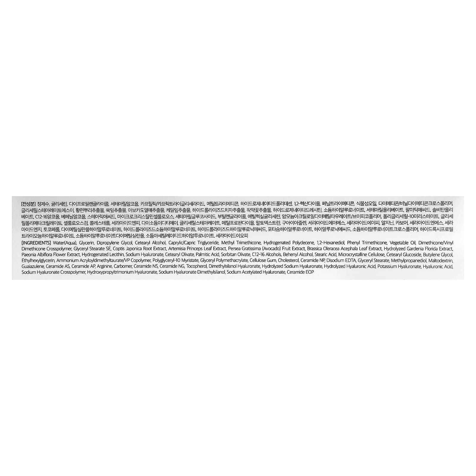 Вода (Aqua), глицерин, дипропиленгликоль, цетеариловый спирт, каприловый/каприновый триглицерид, метилтриметикон, гидрогенизированный полидецен, 1,2-гександиол, фенилтриметикон, растительное масло, диметикон/винил диметикон кроссполимер, глицерил стеарат эмульгирующий, экстракт корня коптиса японского (Coptis japonica), экстракт листьев полыни корейской (Artemisia princeps), экстракт плодов авокадо (Persea gratissima), экстракт листьев кудрявой капусты (Brassica oleracea acephala), гидролизованный экстракт гардении жасминовидной (Gardenia florida), экстракт цветков пиона молочноцветкового (Paeonia albiflora), гидрогенизированный лецитин, гиалуронат натрия, цетеарил оливат, пальмитиновая кислота, сорбитан оливат, c12-16 спирты, бегениловый спирт, стеариновая кислота, микрокристаллическая целлюлоза, цетеариловый глюкозид, бутиленгликоль, этилгексилглицерин, аммоний акрилоилдиметилтаурат/ВП сополимер, полиглицерил-10 миристат, глицерил полиметакрилат, целлюлозная камедь, холестерина, керамид NP, двунатриевая ЭДТК, глицерил стеарат, метилпропандиол, мальтодекстрин, гвайазулен, керамид AS, керамид АP, аргинин, карбомер, керамид NS, керамид нг, токоферол, диметилсиланол гиалуронат, гидролизованный гиалуронат натрия, гидролизованная гиалуроновая кислота, гиалуронат калия, гиалуроновая кислота, кроссполимер гиалуроната натрия, гиалуронат гидроксипропилтримония, гиалуронат натрия диметилсиланол, ацетилированный гиалуронат натрия, керамид EOP.