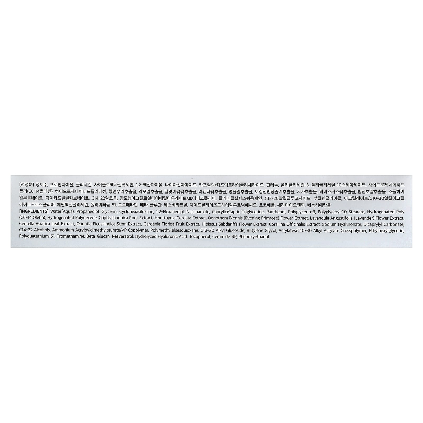 Вода (Aqua), пропандиол, глицерин, циклогексасилоксан, 1,2-гександиол, Ниацинамид, каприловый/каприновый триглицерид, пантенол, полиглицерин-3, полиглицерил-10 стеарат, Гидрогенизированный полиполи (олефин C6-14), Гидрогенизированный полидецен, экстракт корня коптиса японского (Coptis japonica), экстракт хауттюйнии (Houttuynia cordata), экстракт цветков примулы вечерней (Oenothera biennis), экстракт цветков лаванды (Lavandula angustifolia), Экстракт листьев центеллы азиатской, экстракт стеблей опунции индийской (Opuntia ficus-indica), Экстракт плодов гардении флориды, экстракт цветов розеллы (Hibiscus sabdariffa), экстракт кораллины лекарственной (Corallina officinalis), гиалуронат натрия, дикаприлилкарбонат, спирты C14-22, аммоний акрилоилдиметилтаурат/ВП сополимер, полиметилсилсесквиоксан, c12-20 алкил глюкозид, бутиленгликоль, Акрилат/C10-30 Алкилакрилатный кроссполимер, этилгексилглицерин, поликватерниум-51, трометамин, бета-глюкан, ресвератрол, гидролизованная гиалуроновая кислота, Токоферол, Керамид NP, феноксиэтанол.