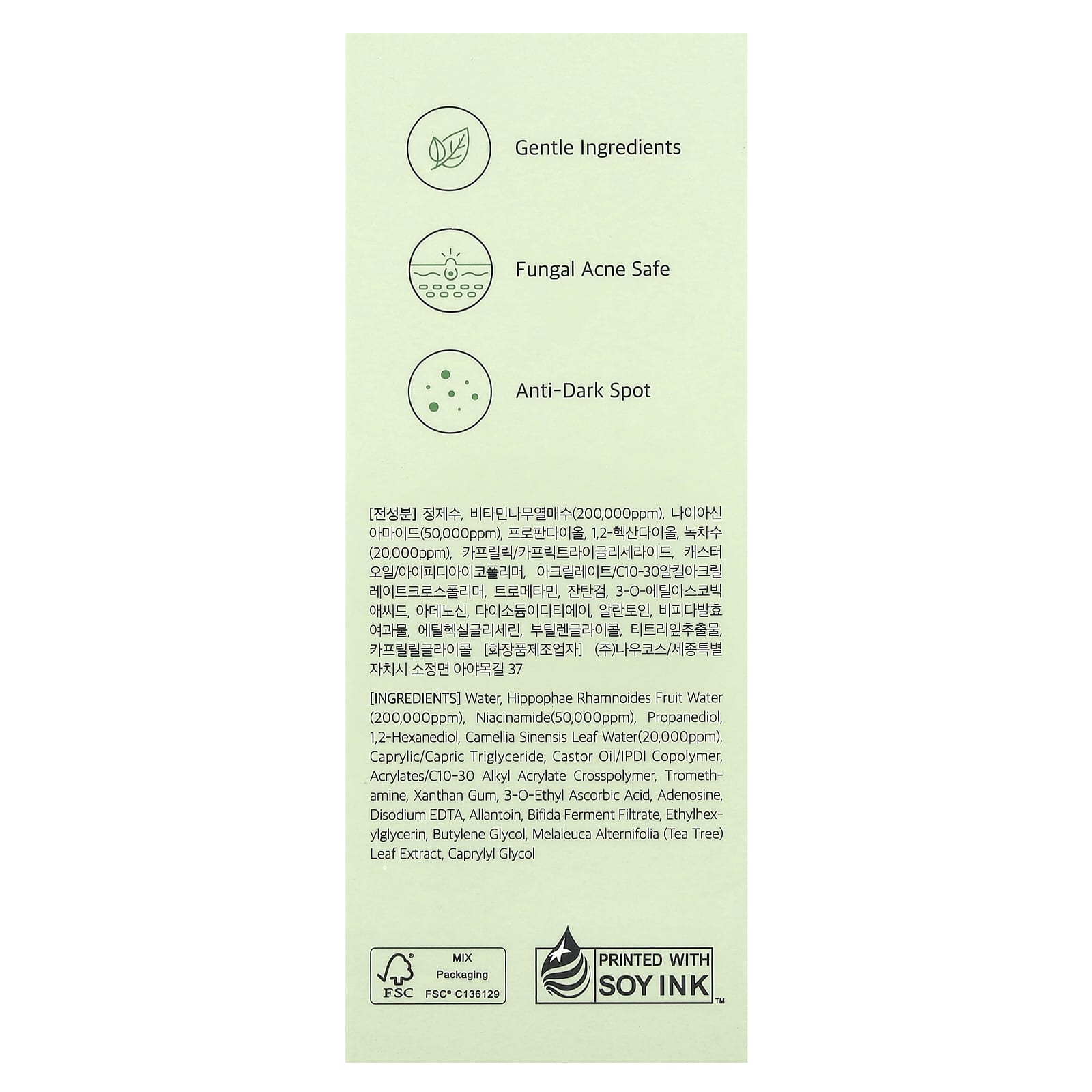 Вода, вода из плодов облепихи (Hippophae rhamnoides) (200 000 част. / млн), ниацинамид (50 000 част. / млн), пропандиол, 1,2-гександиол, вода из листьев камелии китайской (20 000 част. / млн), каприловый/каприновый триглицерид, касторовое масло/изофорон диизоцианата сополимер, акрилат/c10-30 алкил акрилат кроссполимер, трометамин, ксантановая камедь, 3-о-этил-аскорбиновая кислота, аденозин, двунатриевая ЭДТК, аллантоин, фильтрат бифидоброжения, этилгексилглицерин, бутиленгликоль, экстракт листьев чайного дерева (Melaleuca alternifolia), каприлилгликоль.