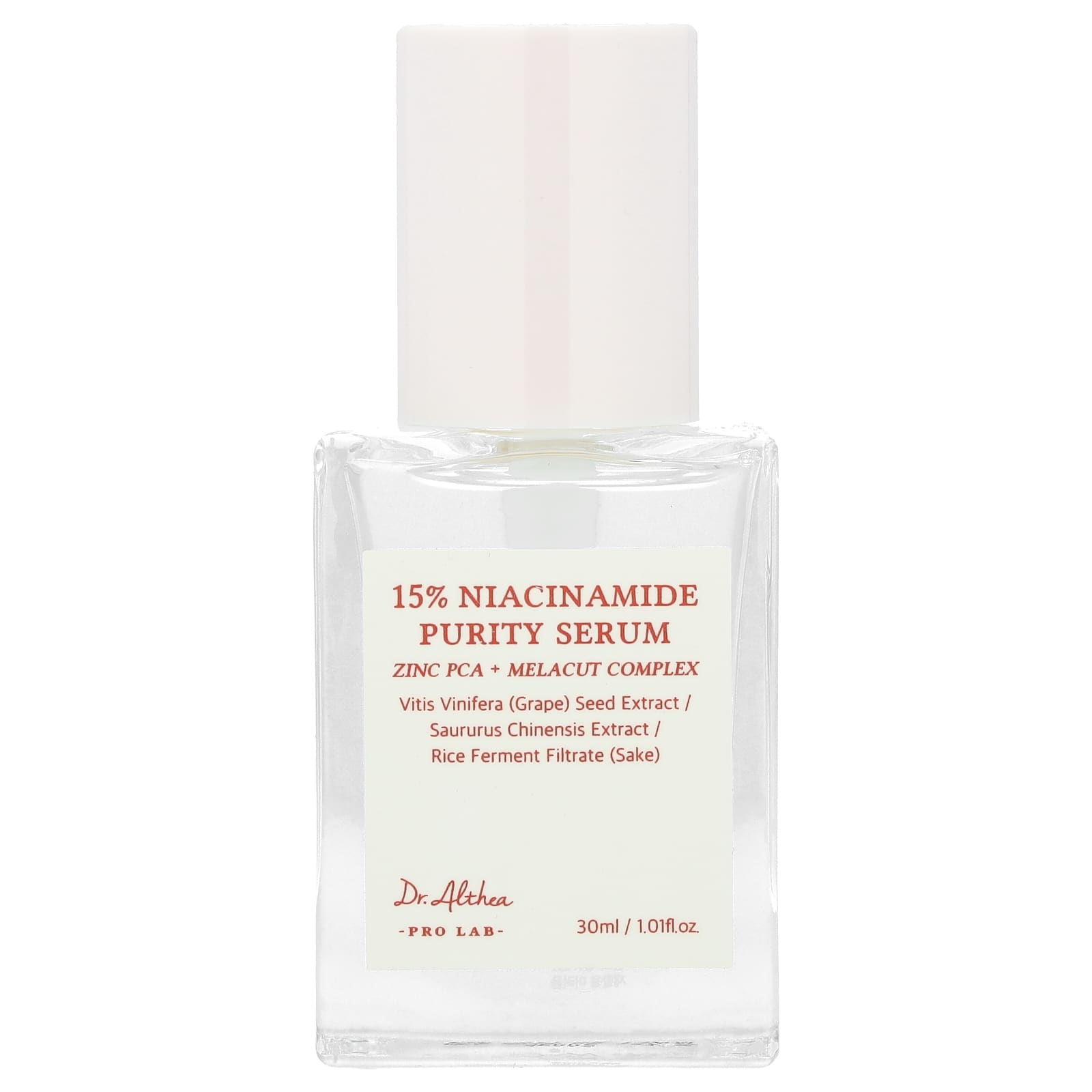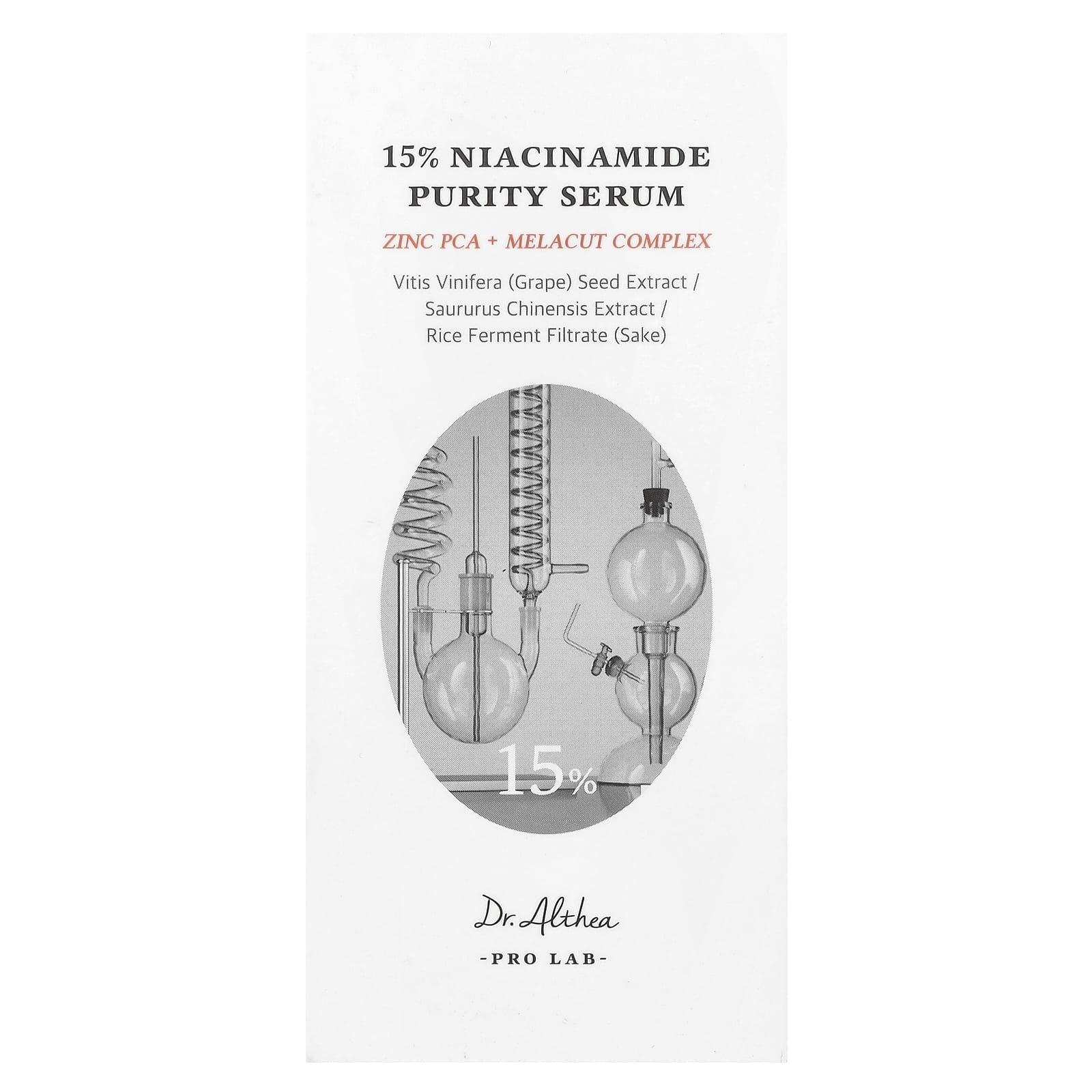 Сыворотка от доктора Альтеи с 15% ниацинамидом содержит 15% ниацинамида в высокой концентрации и обеспечивает эффективное осветление и уход за порами. Наша сыворотка Purity содержит цинк PCA для регулирования выработки кожного жира и жира, а также комплекс MELACUT, успокаивающий кожу и улучшающий ее текстуру.