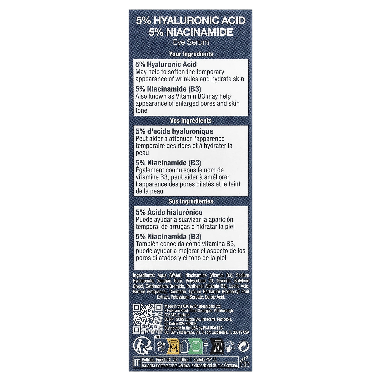 Наша сыворотка для глаз содержит молочную кислоту, гиалуроновую кислоту и никотинамид, которые могут временно улучшить внешний вид морщин и улучшить текстуру кожи.