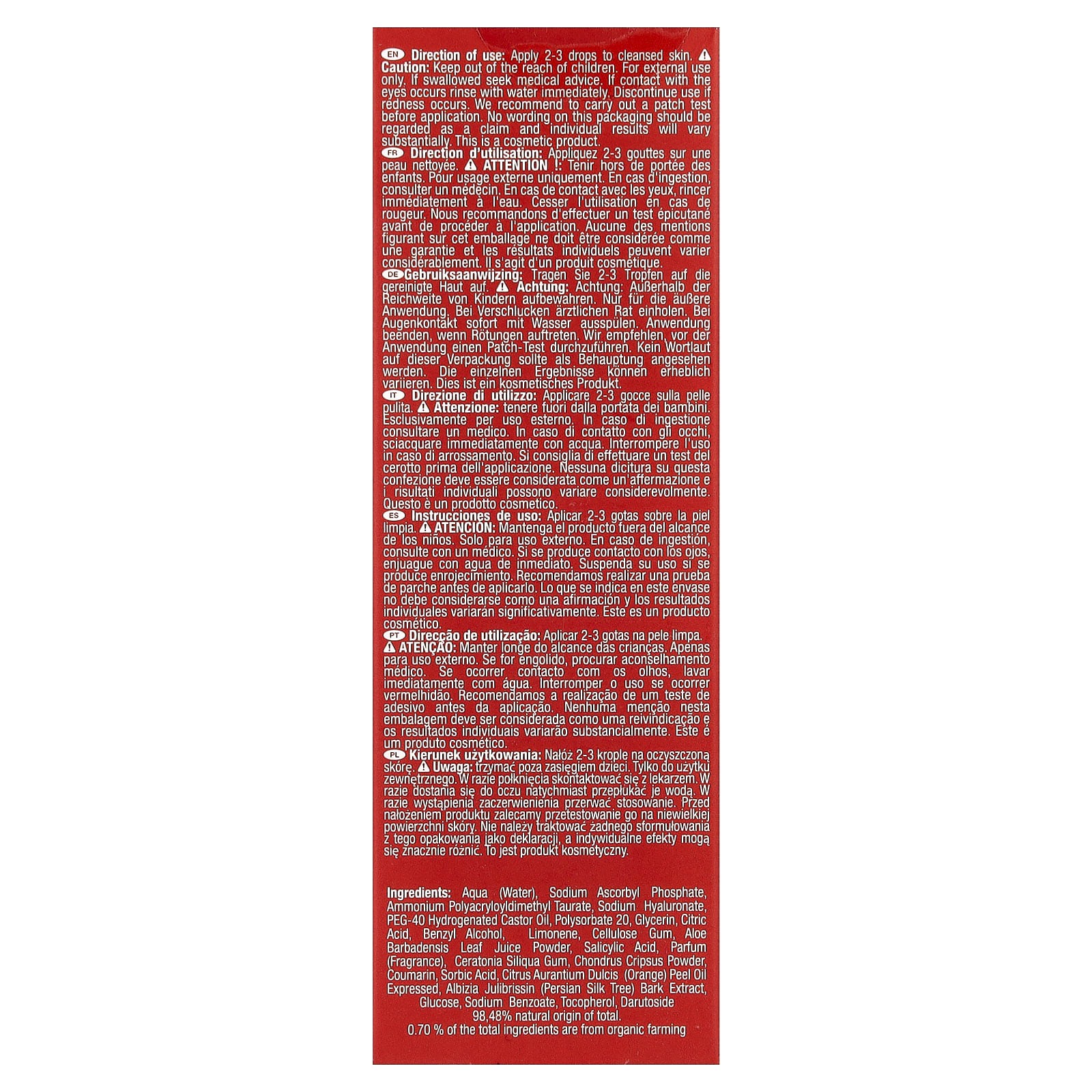 Вода (Aqua), аскорбил фосфат натрия, полиакрилоилдиметил таурат аммония, гиалуронат натрия, ПЭГ-40 гидрогенизированное касторовое масло, полисорбат 20, глицерин, лимонная кислота, бензиловый спирт, лимонен, целлюлозная камедь, порошок из сока листьев алоэ вера (Aloe barbadensis), салициловая кислота, парфюмерная композиция (отдушка), камедь рожкового дерева (Ceratonia siliqua), порошок каррагенана (Chondrus crispus), кумарин, сорбиновая кислота, масло из цедры апельсина (Citrus aurantium dulcis), экстракт коры персидского шелкового дерева (Albizia julibrissin), глюкоза, бензоат натрия, токоферол, дарутозид.
