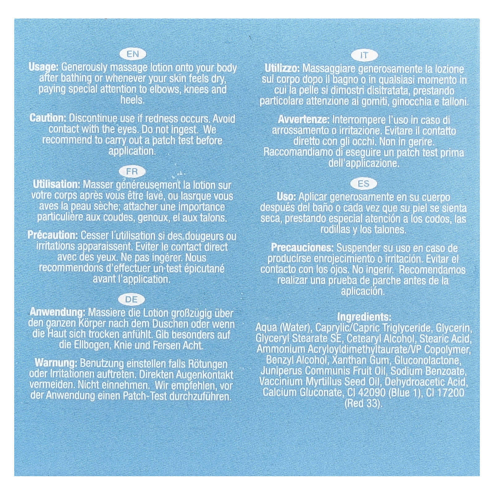 Вода (Aqua), каприловый/каприновый триглицерид, глицерин, глицерил стеарат эмульгирующий, цетеариловый спирт, стеариновая кислота, аммоний акрилоилдиметилтаурат/ВП сополимер, бензиловый спирт, ксантановая камедь, глюконолактон и масло из плодов можжевельника (Juniperus communis), масло семян черники (Vaccinium myrtillus), дегидроуксусная кислота, глюконат кальция, краситель синий 1 (CI 42090), краситель красный 33 (CI 17200).