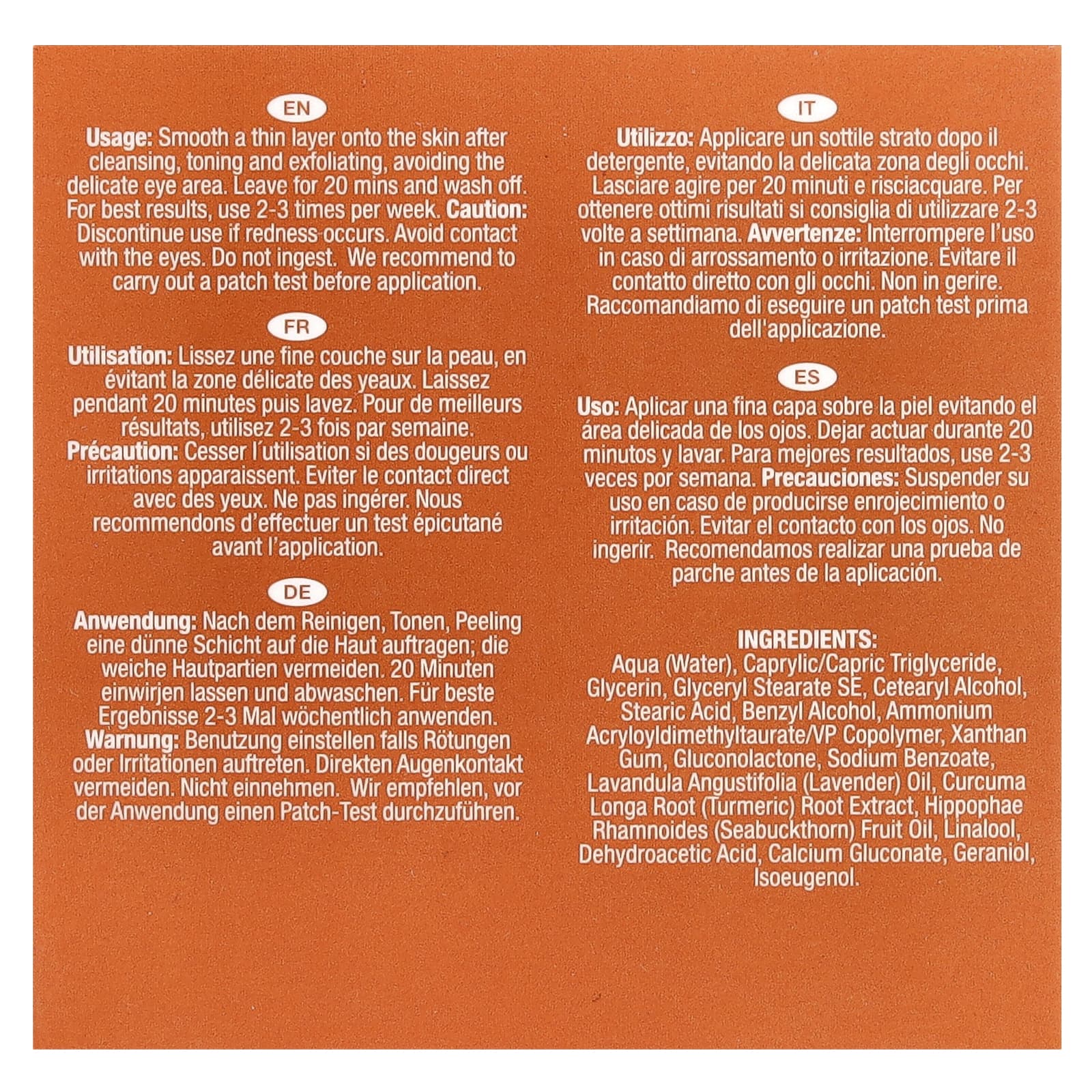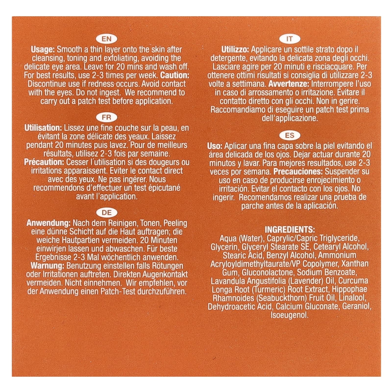 Нанесите тонким слоем на кожу после очищения, тонизирования и отшелушивания, избегая нежной области вокруг глаз. Оставьте на 20 минут и смойте. Для достижения наилучших результатов используйте 2–3 раза в неделю.