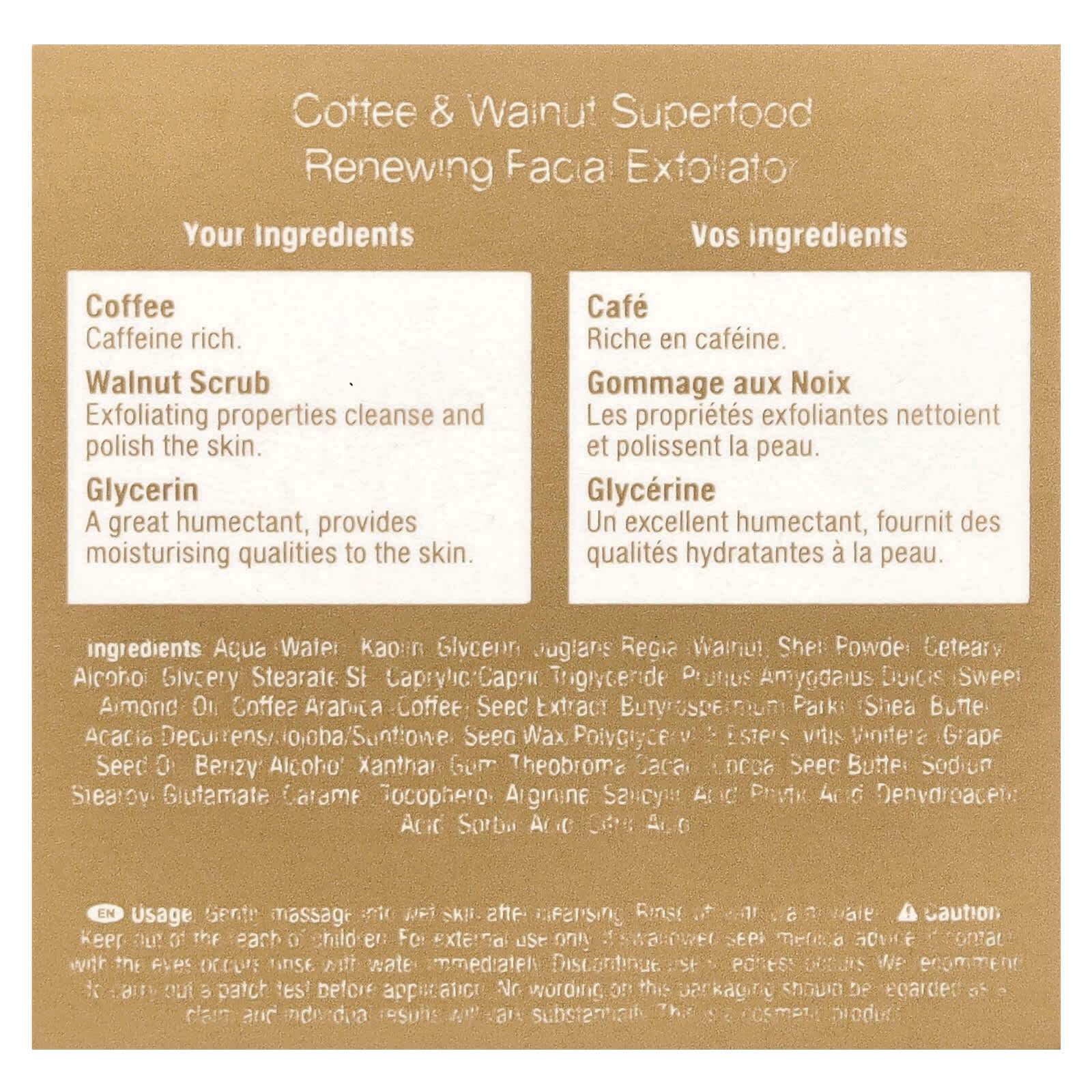 Вода (Aqua), каолин, глицерин, порошок из скорлупы грецкого ореха Juglans regia, цетеариловый спирт, глицерил стеарат эмульгирующий, каприловый/каприновый триглицерид, масло сладкого миндаля (Prunus amygdalus dulcis), экстракт зерен кофе арабики (Coffea arabica), масло ши (Butyrospermum parkii), акация (Acacia decurrens), жожоба, подсолнечный воск, полиглицериловые эфиры, масло из виноградных косточек (Vitis vinifera), бензиловый спирт, ксантановая камедь, масло из зерен какао (Theobroma cacao), стеароил натрия, глутамат карамель, токоферол, аргинин, салициловая кислота, фитиновая кислота, дегидроуксусная кислота, сорбиновая кислота, лимонная кислота.