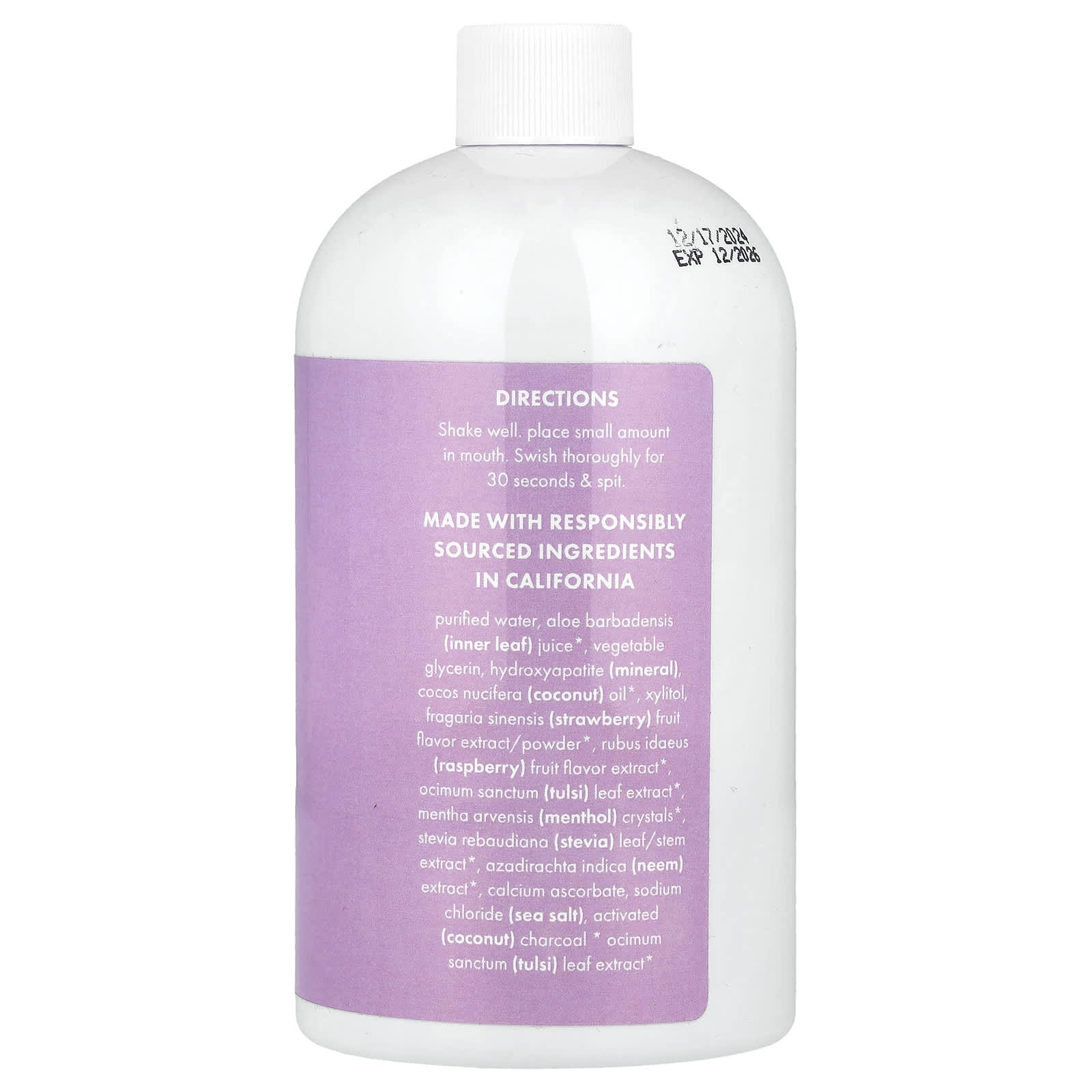 Очищенная вода, сок листьев алоэ вера (Aloe barbadensis)*, растительный глицерин, гидроксиапатит (минерал), кокосовое масло (Cocos nucifera)*, ксилитол, экстракт/порошок из ароматизатора «Клубника» (Fragaria sinensis)*, экстракт ягод малины (Rubus idaeus)*, экстракт листьев туласи (Ocimum sanctum)*, кристаллы ментола (Mentha arvensis)*, экстракт листьев/стебля стевии (Stevia rebaudiana)*, экстракт нима (Azadirachta indica)*, аскорбат кальция, хлорид натрия (морская соль), активированный уголь (кокосовый)*, экстракт листьев туласи (Ocimum sanctum)*.