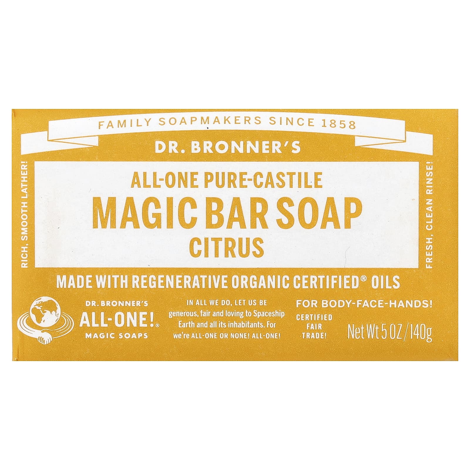 История исцеления доктора Bronner's: Мыловар в третьем поколении Эмануэль Броннер (род. 1908) потерял родителей из-за Холокоста, возродил виденье человечества, объединившегося благодаря религиозным и межэтническим противопоставлениям, — основал компанию по производству экологического мыла (1948), использует лейблы для распространения All-One! сообщение. По-прежнему на 100% семейное предприятие Bronner, компания Dr. Bronner's продолжает способствовать позитивным изменениям. Любите и чтите себя, друг друга и Космический Корабль Earth!/Regenerative Organic Certified®=высокий, самый комплексный сельскохозяйственный стандарт — строгие требования к здоровью почвы, благополучию животных и социальной справедливости! Лучшее мыло для тела, дома и земного шара!