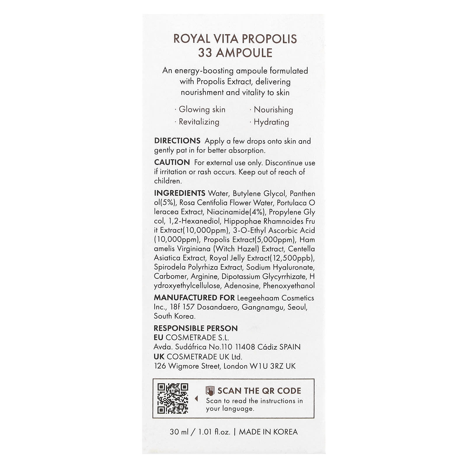 Вода, бутиленгликоль, пантенол (5%), вода из цветков розы столистной (Rosa centifolia), экстракт портулака огородного (Portulaca oleracea), ниацинамид (4%), пропиленгликоль, 1,2-гександиол, экстракт плодов облепихи (hippophae rhamnoides) (10 000 част. / млн), 3-о-этил аскорбиновая кислота (10 000 част. / Млн), экстракт прополиса (5000 част. / млн), экстракт гамамелиса (Hamamelis virginiana), экстракт готу колы (Centella asiatica), экстракт маточного молочка (12500 част. / млрд), экстракт спироделы полиризы, гиалуронат натрия, карбомер, аргинин, дикалия глицирризат, гидроксиэтилцеллюлоза, аденозин, феноксиэтанол.