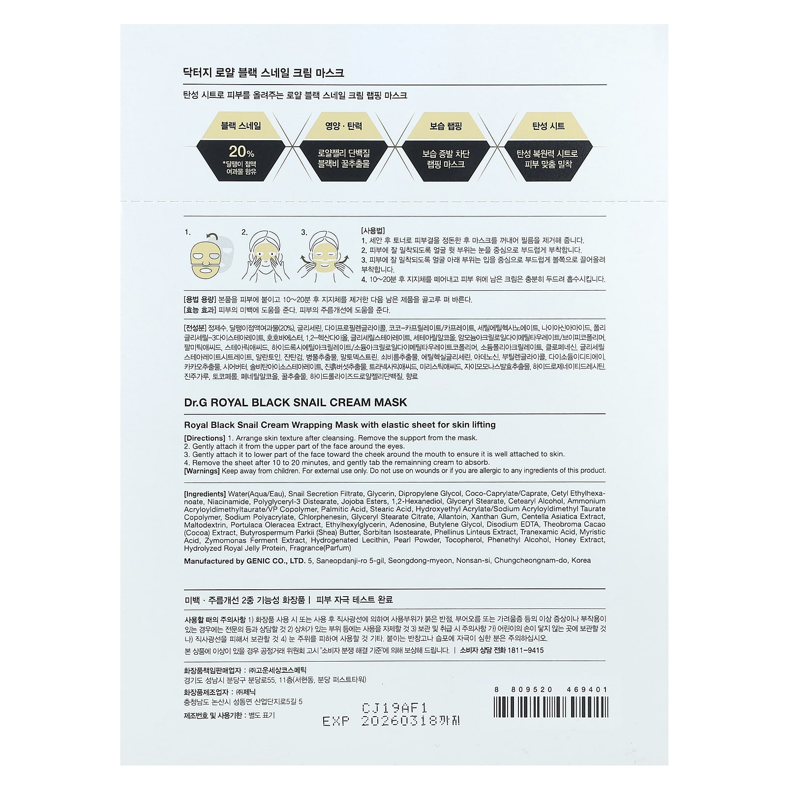 Вода, фильтрат секрета улитки, глицерин, дипропиленгликоль, коко-каприлат/капрат, цетилэтилгексаноат, никотинамид, полиглицерил-3 дистеарат, эфиры жожоба, 1,2-гександиол, глицерил стеарат, цетеариловый спирт, аммоний акрилоилдиметилтаурат/ВП сополимер, пальмитиновая кислота, стеариновая кислота, гидроксиэтил акрилат/натрия акрилоилдиметилтаурата сополимер, полиакрилат натрия, хлорфенезин, глицерил стеарат цитрат, аллантоин, ксантановая камедь, экстракт готу колы (Centella asiatica), мальтодекстрин, экстракт портулака огородного (Portulaca oleracea), этилгексилглицерин, аденозин, бутиленгликоль, двунатриевая ЭДТК, экстракт какао (Theobroma cacao), масло ши (Butyrospermum parkii), сорбитан изостеарат, экстракт санхвана (Phellinus linteus), транексамовая кислота, миристиновая кислота, экстракт ферментов зимомонаса (Zymomonas), гидрогенизированный лецитин, жемчужный порошок, токоферол, фенетиловый спирт, экстракт меда, гидролизованный белок маточного молочка, отдушка (парфюмерная композиция).