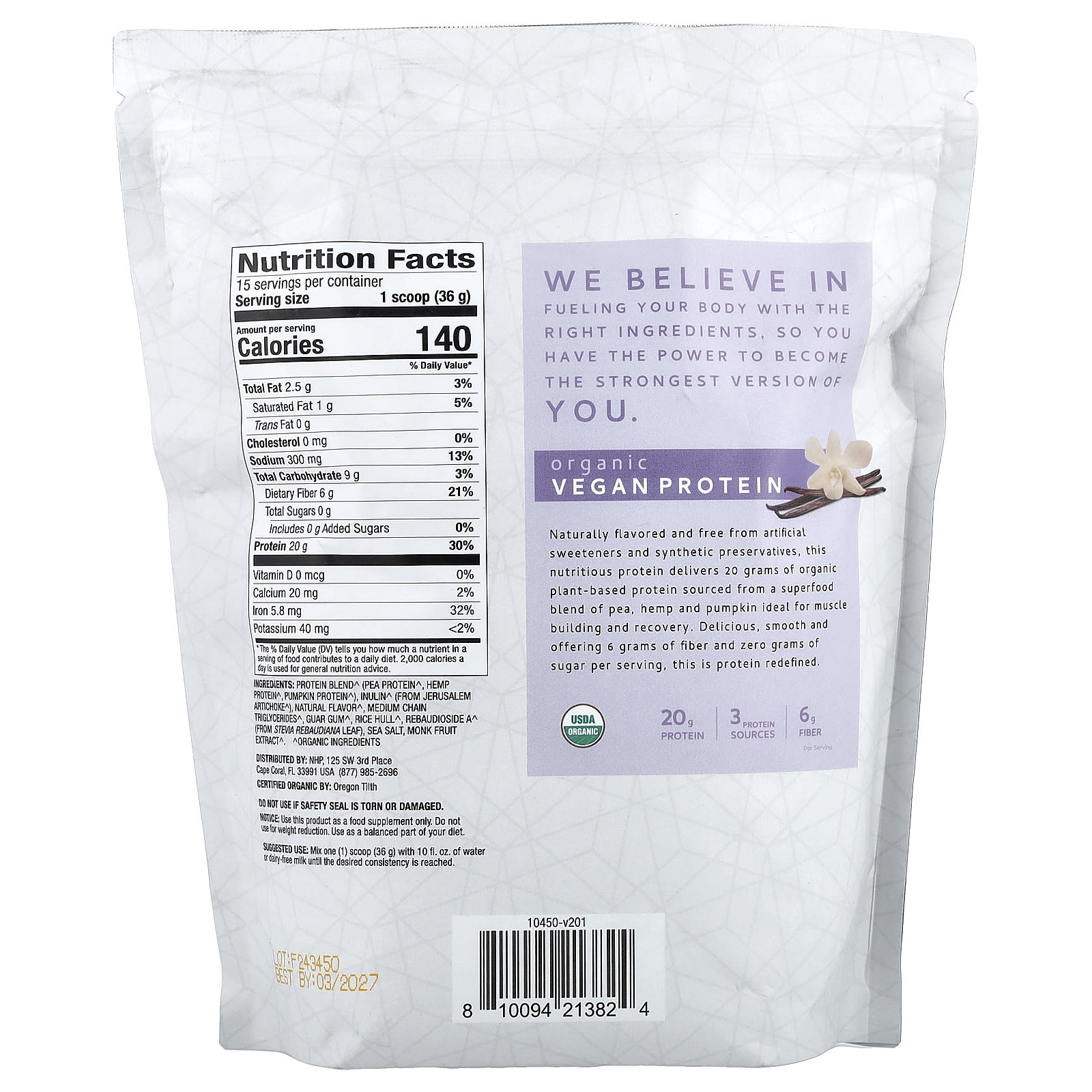 Этот питательный протеин с натуральным вкусом и не содержащий искусственных подсластителей и синтетических консервантов содержит 20 граммов органического растительного белка, полученного из смеси суперфудов гороха, конопли и тыквы, идеально подходящего для наращивания мышечной массы и восстановления. Вкусный и мягкий продукт, содержащий 6 грамм клетчатки и ноль граммов сахара в 1 порции — это новый подход к протеину.