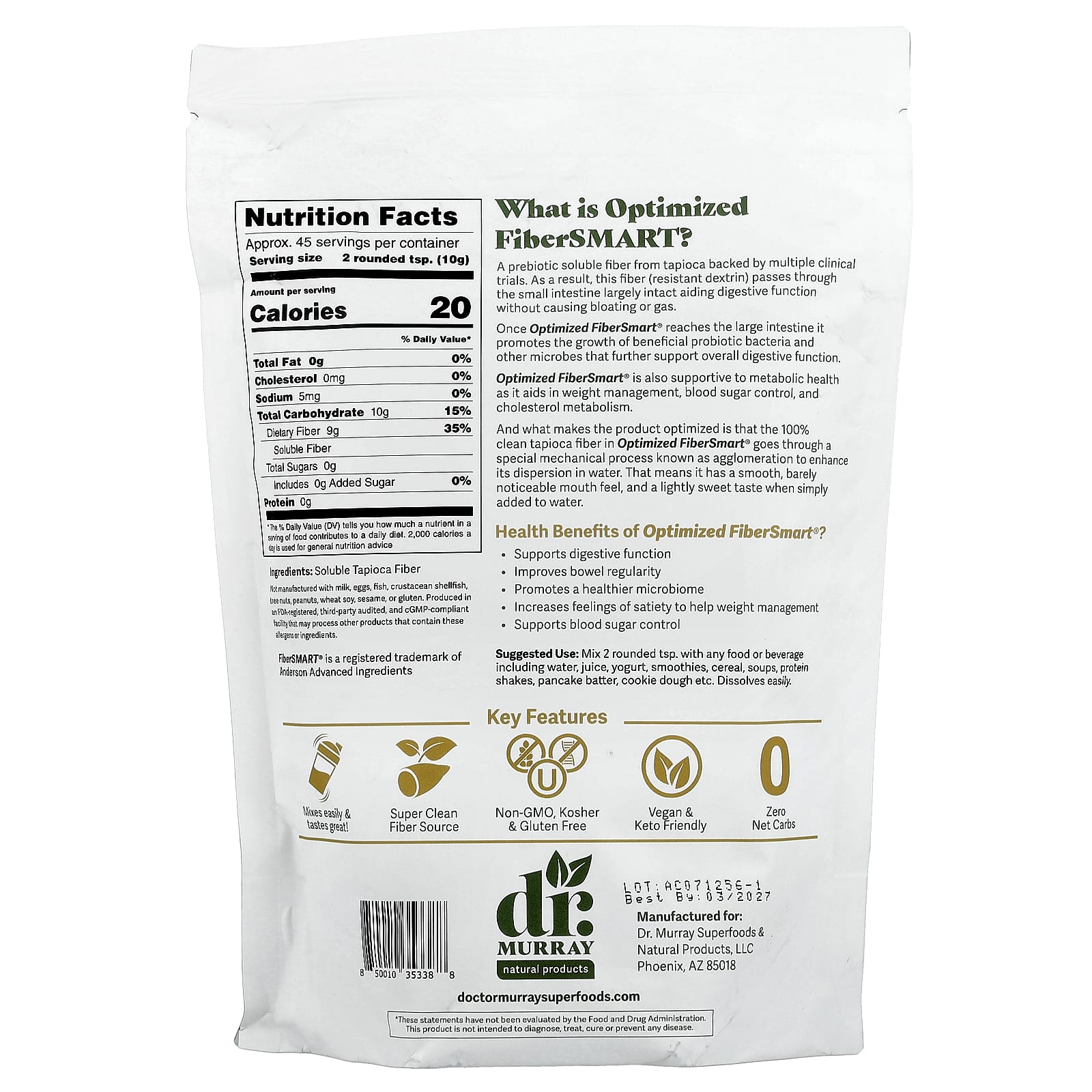 Продукт оптимизирован тем, что на 100% чистое волокно тапиоки в Optimized FiberSmart® проходит специальный механический процесс, известный как агломерация, чтобы улучшить его диспергирование в воде. Это означает, что он имеет гладкое, едва заметное ощущение во рту и слегка сладкий вкус, если просто добавить его в воду.