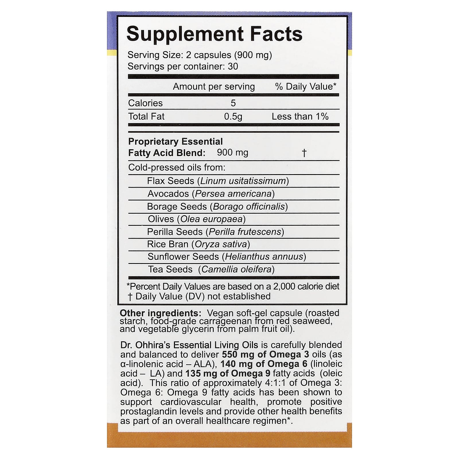 Добавки с эфирными маслами Essential Living Oils от Dr. Ohhira тщательно смешаны и сбалансированы. Средство содержит 550 мг масел с жирными кислотами омега-3 (в виде альфа-линоленовой кислоты — АЛК), 140 мг с омега-6 (линолевая кислота) и 135 мг с омега-9 (олеиновая кислота). Примерное соотношение: 4: 1: 1 (омега-3 : омега-6: омега-9). Доказано. что эти жирные кислоты поддерживают здоровье сердечно-сосудистой системы и нормальный уровень простагландинов, а также обеспечивают другие преимущества для здоровья в рамках общего здорового образа жизни.