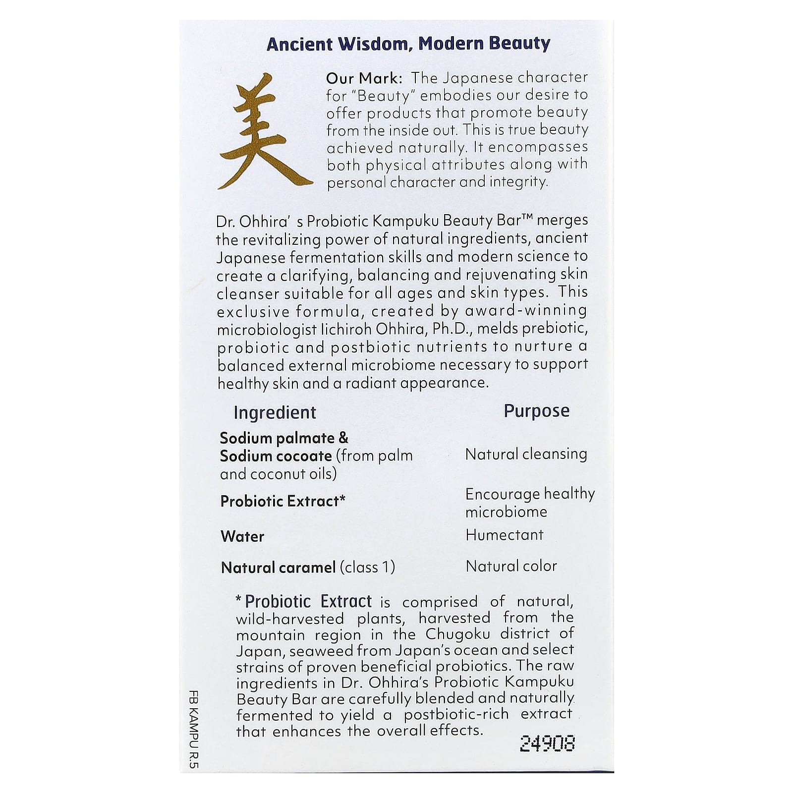 Компания Dr. Пробиотик Kampuku Beauty Bar™ от Ohhira сочетает в себе восстанавливающую силу натуральных ингредиентов, древние японские методы ферментации и современные научные данные для создания очищающего, балансирующего и омолаживающего очищающего средства, которое подходит для любого возраста и типа кожи. Эта эксклюзивная формула, созданная удостоенным наград микробиологом Иитиро Охира (Iichiroh Ohhira), доктором наук, сочетает в себе пребиотические, пробиотические и постбиотические питательные вещества для поддержания сбалансированного внешнего микробиома, необходимого для поддержания здоровья кожи и сияющего внешнего вида.