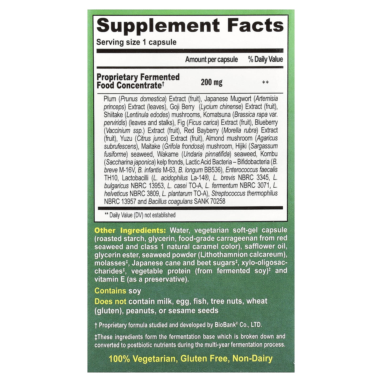 | экстракт плодов сливы (Prunus domestica), экстракт листьев японской полыни (Artemisia princeps), экстракт ягод годжи (Lycium chinense), грибов шиитаке (Lentinula edodes), комацуны (Brassica rapa var. perviridis) (листья и стебли), экстракт плодов инжира (Ficus carica), голубику (подвид Vaccinium) экстракт плодов, экстракт плодов мореллы (Morella rubra), экстракт плодов юдзу (Citrus junos), грибов миндаль (Agaricus subrufescens), гриба-барана (Grifola frondosa), водоросли хиджики (Sargassum fusiforme), водоросли вакаме (Undaria pinnatifida), водоросли комбу (Saccharina japonica), молочнокислые бактерии и бифидобактерии (B. breve M-16V, B. infantis M-63, B. longum BB536), энтерококк faecalis TH10, лактобактерии (L. acidophilus La-14 ®, лактобактерии бревис (L. brevis) NBRC 3345, болгарская палочка (L. bulgaricus) NBRC 13953, лактобактерии казеи (L. casei) NO-A, лактобактерии ферментум (L. fermentum) NBRC 3071, лактобактерии гельветикус (L. helveticus) NBRC 3809, лактобактерии плантарум (L. plantarum) TO-A), термофильный стрептококк (Streptococcus thermophilus) NBRC 13957 и бактерии бациллус коагуланс (Bacillus coagulans) SANK 70258 . | ||