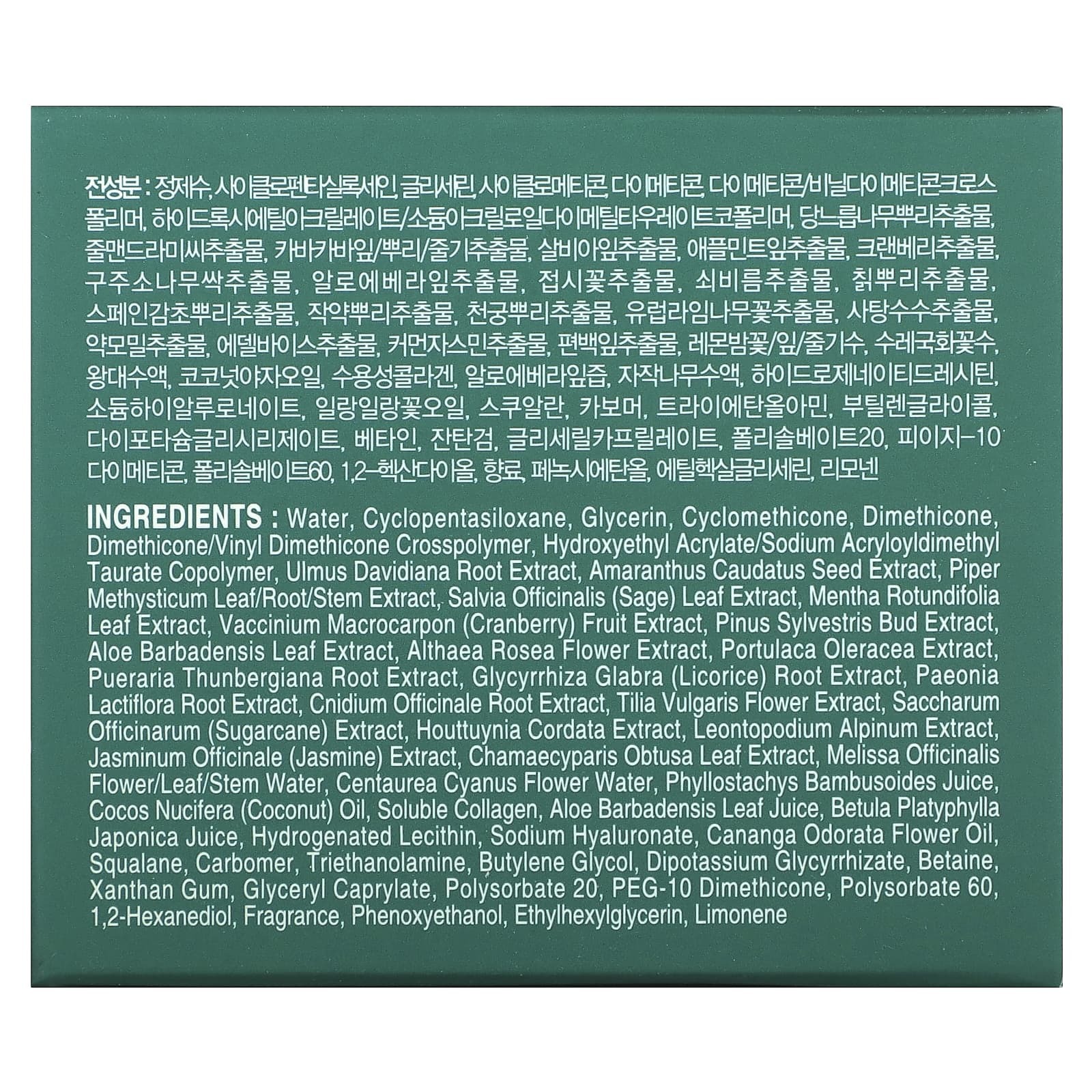Вода, циклопентасилоксан, глицерин, циклометикон, диметикон, диметикон/винил диметикон кроссполимер, гидроксиэтил акрилат/натрия акрилоилдиметилтаурата сополимер, экстракт корня вяза Давида (Ulmus davidiana), экстракт семян амаранта хвостатого (Amaranthus caudatus), экстракт листьев/корней/стеблей перца опьяняющего (Piper methysticum), экстракт листьев шалфея (Salvia officinalis), экстракт листьев мяты яблочной (Mentha rotundifolia), экстракт ягод клюквы (Vaccinium macrocarpon), экстракт почек сосны обыкновенной (Pinus sylvestris), экстракт листьев алоэ вера (Aloe barbadensis), экстракт цветков штокрозы розовой (Althaea rosea), экстракт портулака огородного (Portulaca oleracea), экстракт корня пуэрарии дольчатой (Pueraria thunbergiana), экстракт корня солодки (Glycyrrhiza glabra), экстракт корня пиона молочноцветкового (Paeonia lactiflora), экстракт корня жгун-корня (Cnidium officinale), экстракт цветков тилии обыкновенной (Tilia vulgaris), экстракт сахарного тростника (Saccharum officinarum), экстракт хауттюйнии сердцевидной (Houttuynia cordata), экстракт эдельвейса альпийского (Leontopodium alpinum), экстракт жасмина (Jasminum officinale), экстракт листьев кипарисовика (Chamaecyparis obtusa), цветок мелиссы лекарственной / из листьев / на стебле, вода из цветков василька (Centaurea cyanus), сок Phyllostachys bambusoides, кокосовое масло (Cocos nucifera), растворимый коллаген, сок из листьев алоэ вера (Aloe barbadensis), сок березы плосколистной (Betula platyphylla japonica), гидрогенизированный лецитин, гиалуронат натрия, масло из цветков иланг-иланга (Cananga odorata), сквалан, карбомер, триэтаноламин, бутиленгликоль, дикалия глицирризат, бетаин, ксантановая камедь, глицерил каприлат, полисорбат 20, ПЭГ-10 диметикон, полисорбат 60, 1,2-гександиол, отдушка, феноксиэтанол, этилгексилглицерин, лимонен.