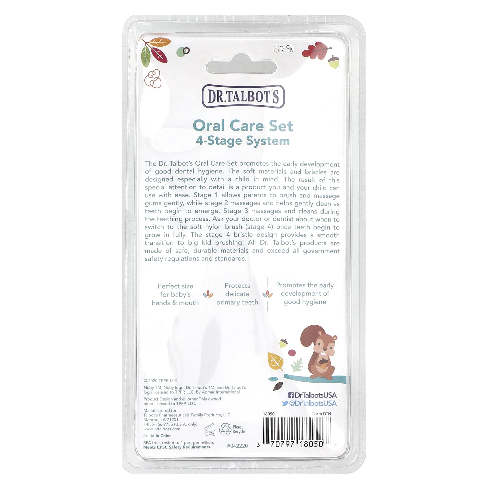 Доктор Набор для ухода за полостью рта от Talbot способствует развитию надлежащей гигиены полости рта. Мягкие материалы и щетина созданы специально для детей. Благодаря особому вниманию к деталям вы и ваш ребенок сможете легко использовать продукт. На первом этапе родители нежно чистят зубы и массируют десны, а на втором этапе - массаж, который помогает бережно чистить зубы по мере появления зубов. Этап 3: массаж и очищение во время прорезывания зубов. Спросите своего врача или стоматолога о том, когда следует переходить на мягкую нейлоновую щетку (этап 4), когда зубы начинают полностью расти. Конструкция из щетины Stage 4 обеспечивает плавный переход к чистке зубов большими детьми! Все Dr. Продукция Talbot изготовлена из безопасных, прочных материалов и превосходит все государственные нормы и стандарты безопасности.