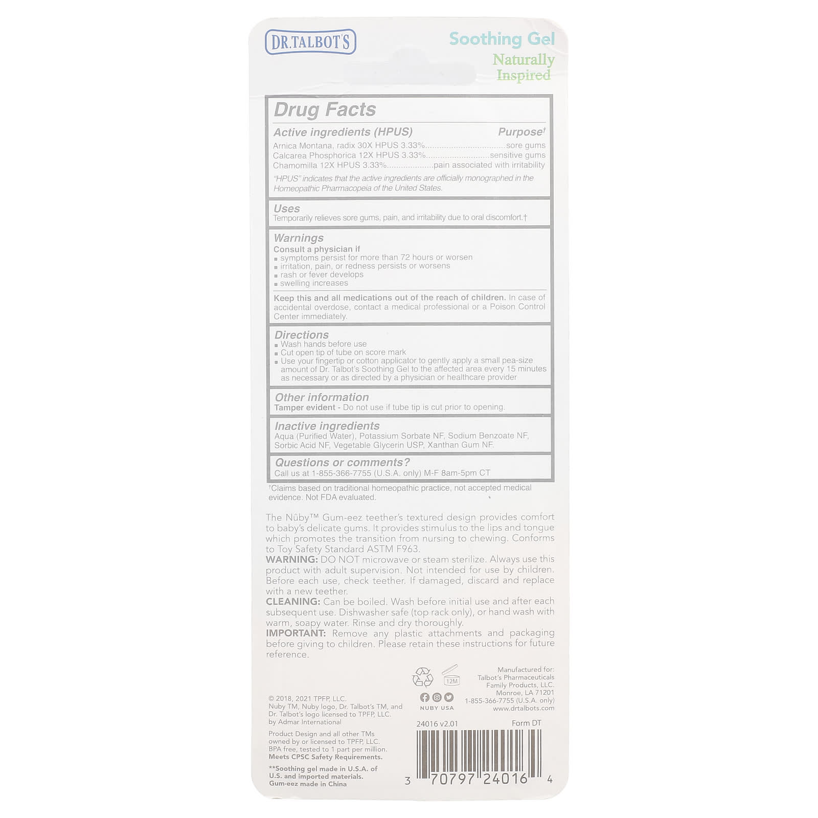 Цельнопищевой магний Успокаивающий гель Talbot с натуральными ингредиентами не содержит бензокаина и безопасен для проглатывания. Используя его, вы можете быть уверены, что ваш ребенок не подвергается воздействию вредных ингредиентов. Успокаивающий гель содержит полезные ингредиенты, такие как ромашка и арника, чтобы успокоить воспаленные десны вашего малыша. Текстурированная зубная щетка для массажа обеспечивает комфорт при уходе за деснами.