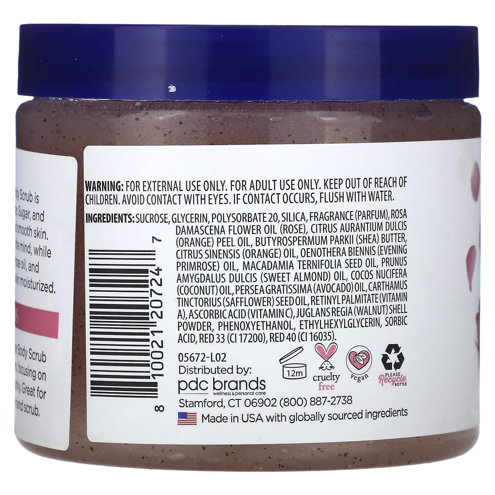 Сахароза, глицерин, полисорбат 20, диоксид кремния, отдушка (парфюмерная композиция), масло из цветков дамасской розы (Rosa damascena), масло из цедры апельсина (Citrus aurantium dulcis), масло ши (Butyrospermum parkii), апельсиновое масло (Citrus sinensis), масло примулы вечерней (Oenothera biennis), масло макадамии (Macadamia ternifolia), масло сладкого миндаля (Prunus amygdalus dulcis), кокосовое масло (Cocos nucifera), масло авокадо (Persea gratissima), масло семян сафлора (Carthamus tinctorius), ретинилпальмитат (витамин A), аскорбиновая кислота (витамин C), порошок из скорлупы грецкого ореха (Juglans regia), феноксиэтанол, этилгексилглицерин, сорбиновая кислота, краситель красный 33 (CI 17200), краситель красный 40 (CI 16035).