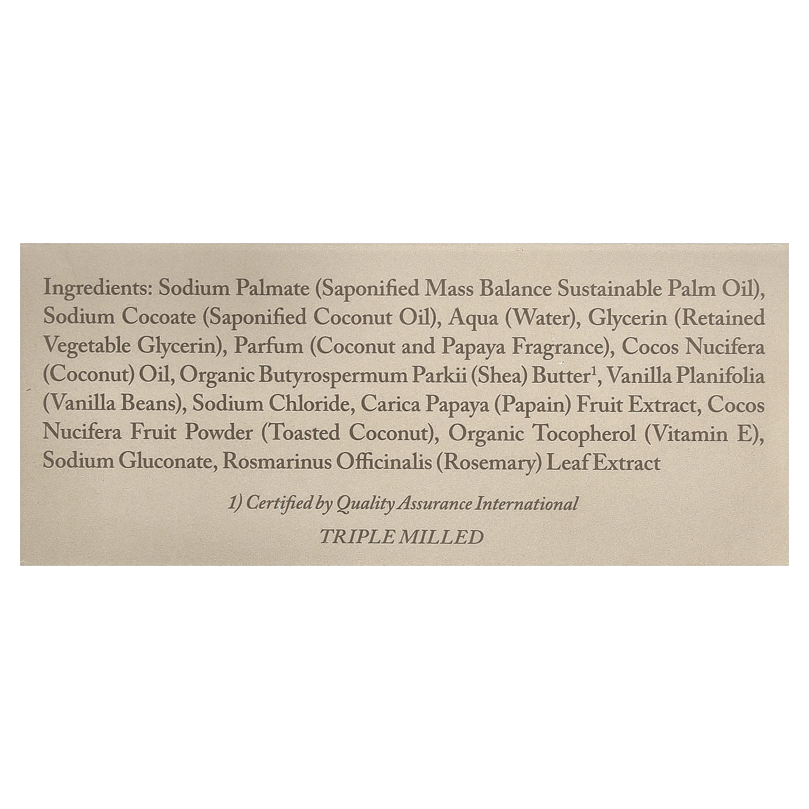 ​Пальмат натрия (омыленное пальмовое масло с балансом массы), кокоат натрия (омыленное кокосовое масло), вода (Aqua), глицерин (сохраненный растительный глицерин), отдушка (ароматизатор кокоса и папайи), кокосовое масло (Cocos nucifera), органическое масло ши (Butyrospermum parkii)1, стручки ванили (Vanilla planifolia), хлорид натрия, экстракт плодов папаина (Carica papaya), порошок из обжаренных кокосовых плодов (Cocos nucifera), органический токоферол (витамин E), глюконат натрия, экстракт листьев розмарина (Rosmarinus officinalis).