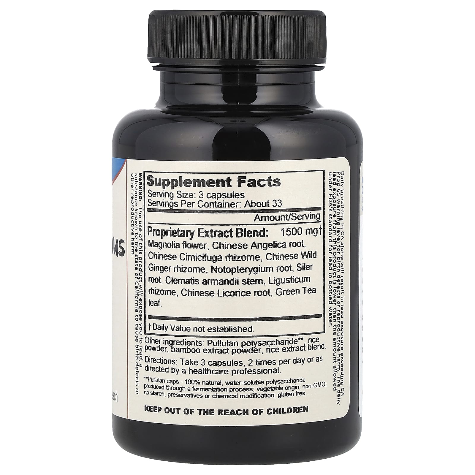 | Запатентованная смесь экстрактов: цветок магнолии, корень дудника китайского, корневище клопогона китайского, корневище дикого имбиря китайского, корень нотоптеригиума, корень силера, стебель клематиса Armandii, корневище бирючины, корень солодки китайской, листья зеленого чая. | 1500 мг | † |