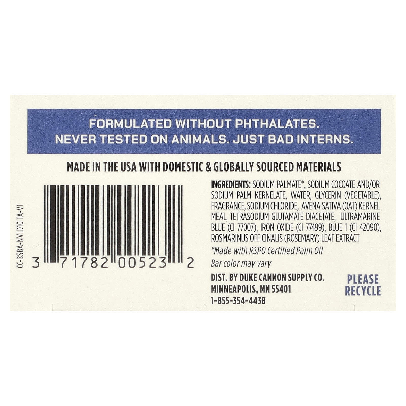 Пальмат натрия *, кокоат натрия и / или пальмоядерат натрия, вода, глицерин (растительный), отдушка, хлорид натрия, овсяная мука (Avena sativa), диацетат глутамата тетранатрия, синий ультрамарин (CI 77007), оксид железа (CI 77499), краситель синий 1 (CI 42090), экстракт листьев розмарина (Rosmarinus officinalis).
