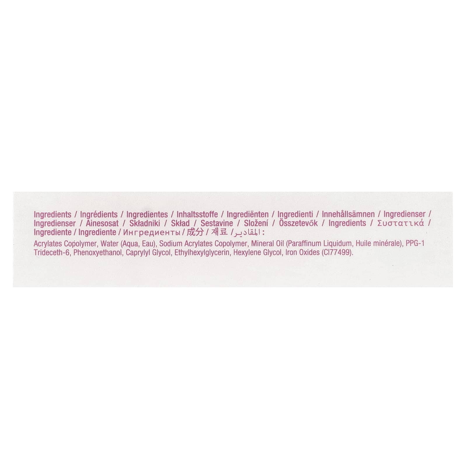 Сополимер акрилатов, вода, сополимер акрилатов натрия, минеральное масло, Huile Minérale), ППГ-1 тридецет-6, феноксиэтанол, каприлилгликоль, этилгексилглицерин, гексиленгликоль, оксиды железа (CI77499).