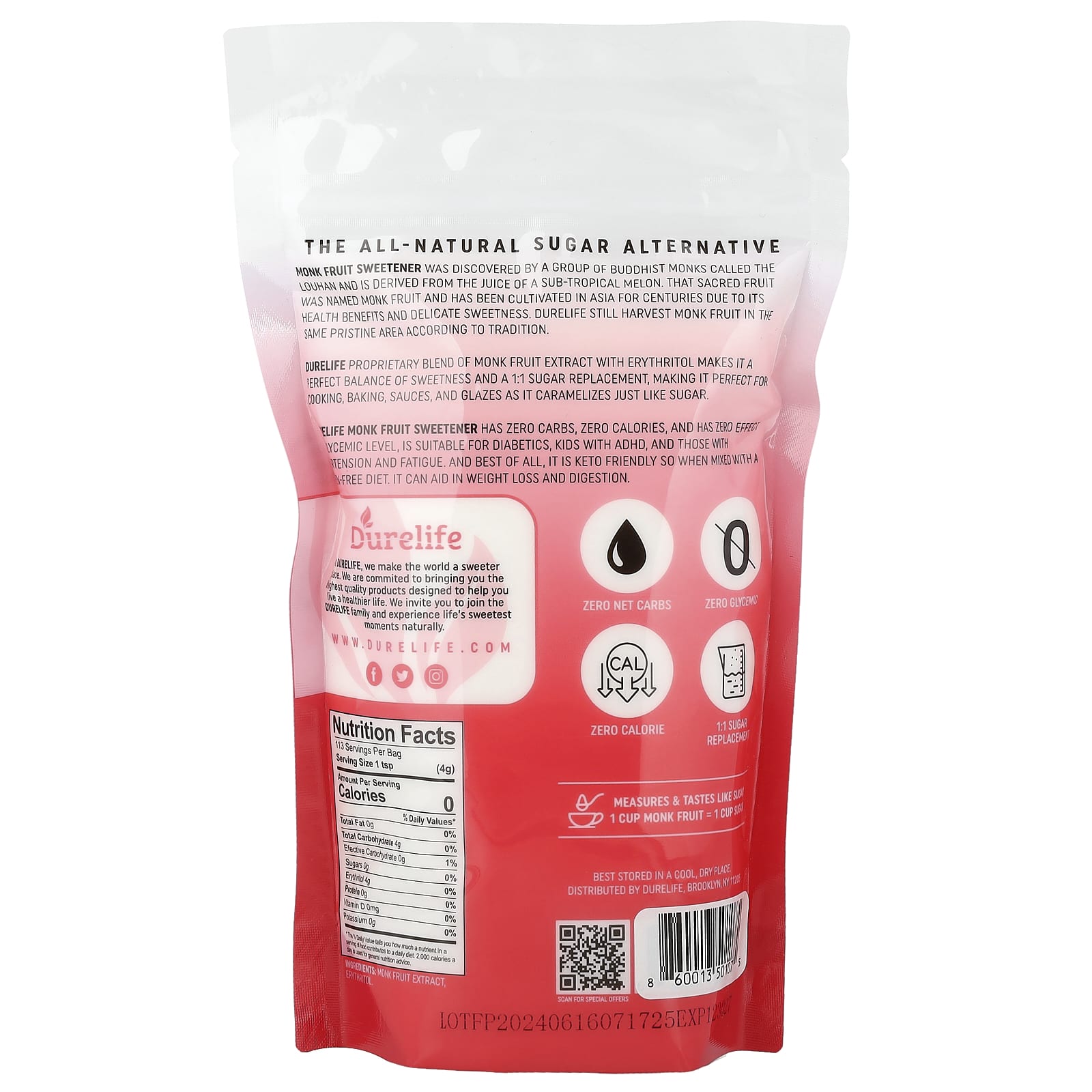 Запатентованная смесь экстракта архата с эритритолом Durelife — это идеальный баланс сладости и заменителя сахара в соотношении 1:1. Она идеально подходит для готовки, выпечки, соусов и глазури, поскольку карамелизируется, как сахар.
