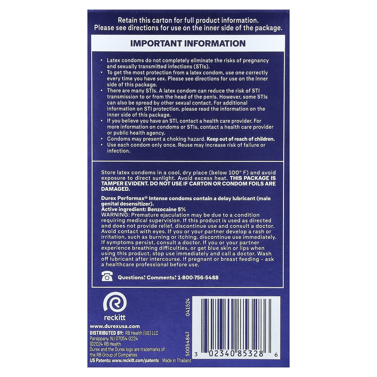 Презервативы Durex Performax® Intense содержат смазку с задержкой (десенсибилизатор мужских половых органов).
